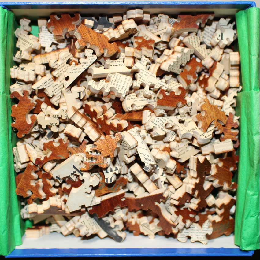 A rare chance to add a special “Lilly Collection” puzzle to your collection. This puzzle is a mini (smaller pieces than a normal Stave puzzle) in the more unusual fantasy cut. It is not easy given the coloring and the newspaper image itself, as well as some great line cutting. An interesting piece of Stave history and a puzzle about interesting history, what a great combo.