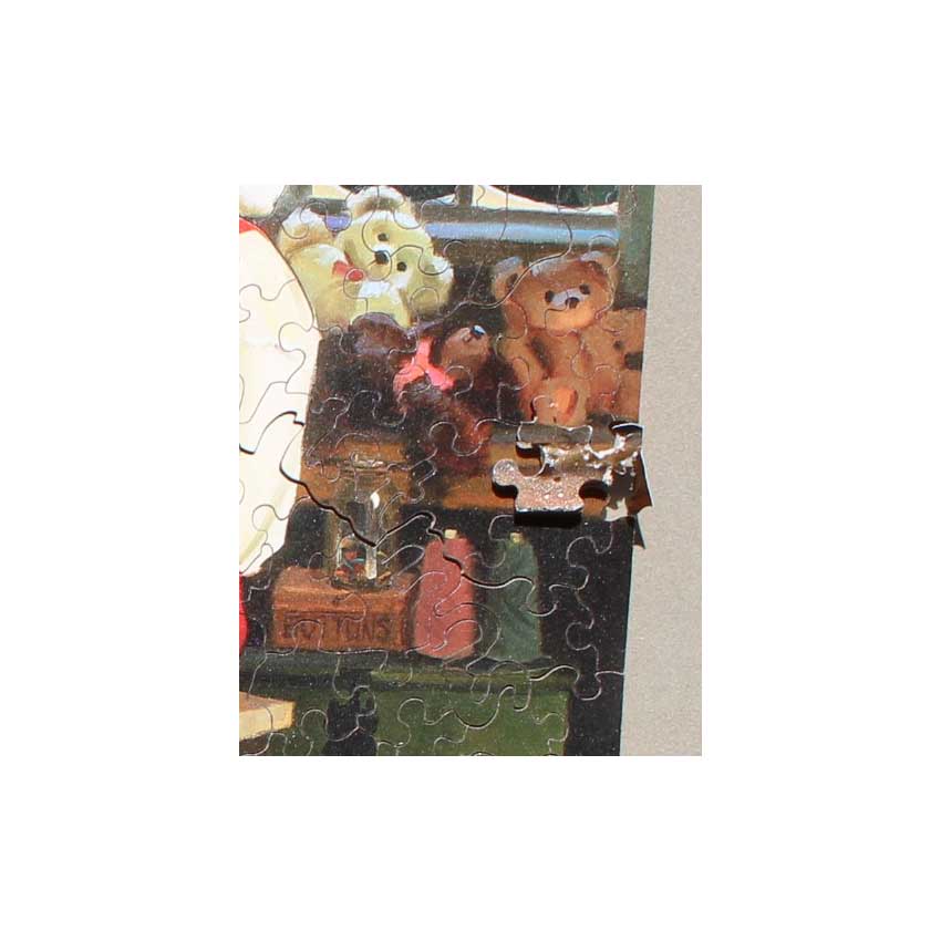 Excellent condition, except for the chewed piece. Piece still be placed in puzzle, however a lot of the wood is missing and ideally should be replaced. Note; If you would like to get it replaced, we can refer you to someone who is a master at replacement pieces. 3 personal pieces (1 x year, 1 x “Christ” 1 x “mas”)