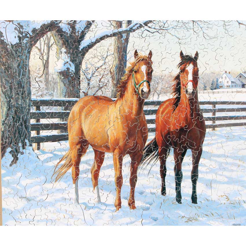 This puzzle really captures the feeling of a cold morning with some horses waiting to get their day started. Includes some fun silhouettes in the cutting. This is signed by the artist and numbered, so most likely cut from a lithograph or similar reprint.