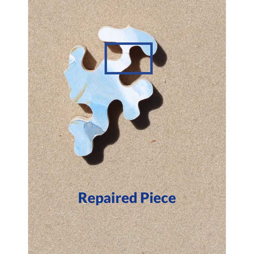 In good condition. The 2 major things to note: 1 piece has been repaired where it partially broke at a really thin cut and there is 1 replacement piece that is a pretty good match, but you do notice at certain angles a different sheen. Puzzle has some wear on the pieces. 4 personal pieces (2 words, 2 names). It has been priced accordingly.