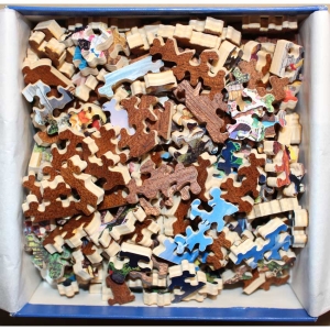 Very good condition with just a little wear. The lid has what looks like a watermark along one edge, but puzzle is fine when we inspected it. Tissue replaced. 1 personal piece (name).