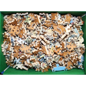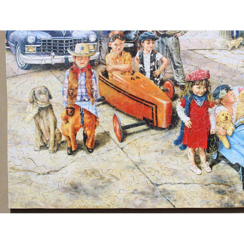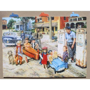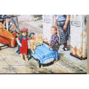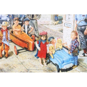 Susan Brabeau is well known for her unique style of displaying everyday scenes along with her great cast of characters that always seem to be getting up to a little mischief or doing something interesting and humorous. Well this puzzle does not fail to do both. You’ve got a few peeved real customers somewhat patiently waiting their turn while this crew of kids take their turn. A great puzzle for you to come up with a backstory.