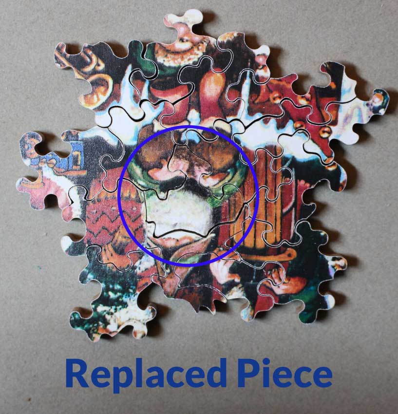 A chance to add a very early Elms (1992) to your puzzle collection. This image, by very popular artist Bill Bell is aptly called “Will The Real Santa…”. Don’t let the relatively modest number of pieces fool you, this puzzle is not easy, lots of interesting cuts and of course loads of Santa’s red suit filling up those puzzle pieces. Good luck and hopefully you’ll finish before next Christmas! (Note: the puzzle count on the box label was overstated from the actual number in the box.)