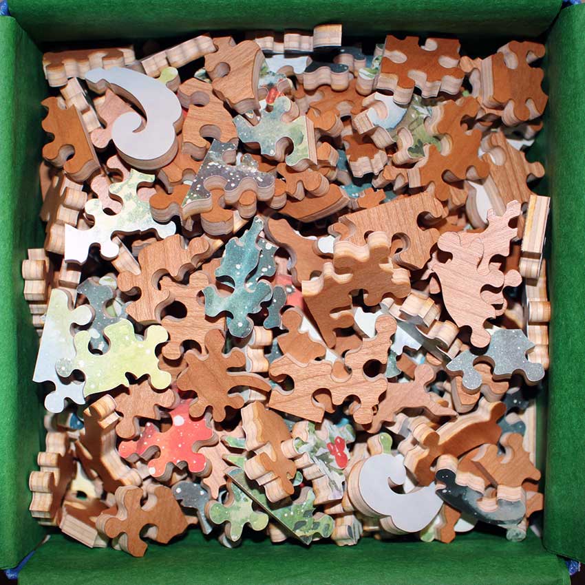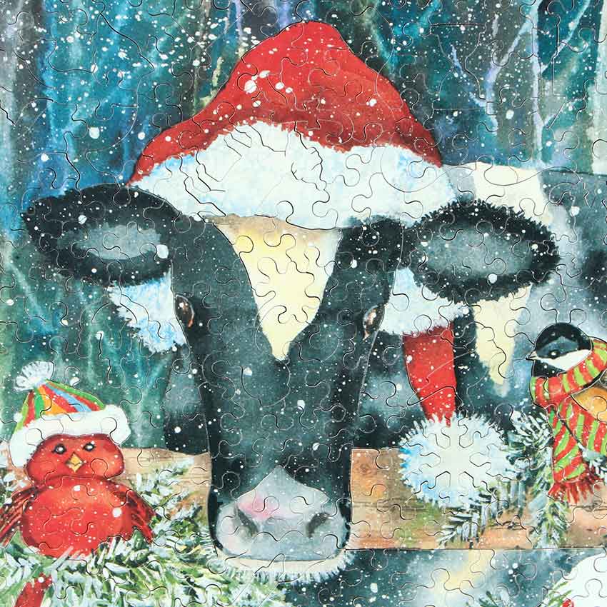 This has to be one of the cutest Christmas puzzles ever. Who can resist that cow with a Santa hat on? A few fun interacting silhouettes complement the nice corners. A classic!