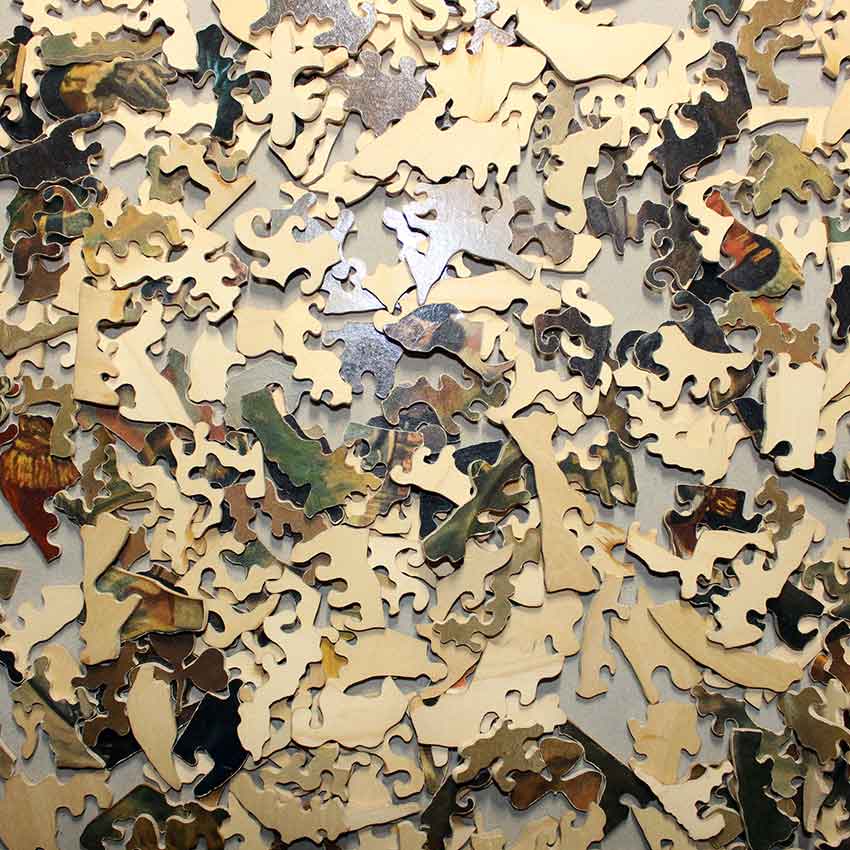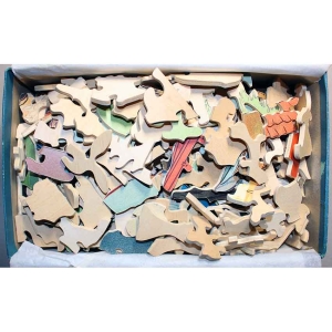 Our count is 2 higher than 506 stated on box. Bright colors and we think artist name may be something like Marken. Illustration is copyright 1902, so maybe puzzle is from around that era, unclear. Interestingly enough has a seahorse silhouette piece, we wonder if this inspired Par! Some chips on the back layer of the puzzle and there are some pieces that are separating their layers, so may need a little TLC on some pieces. Not original box.