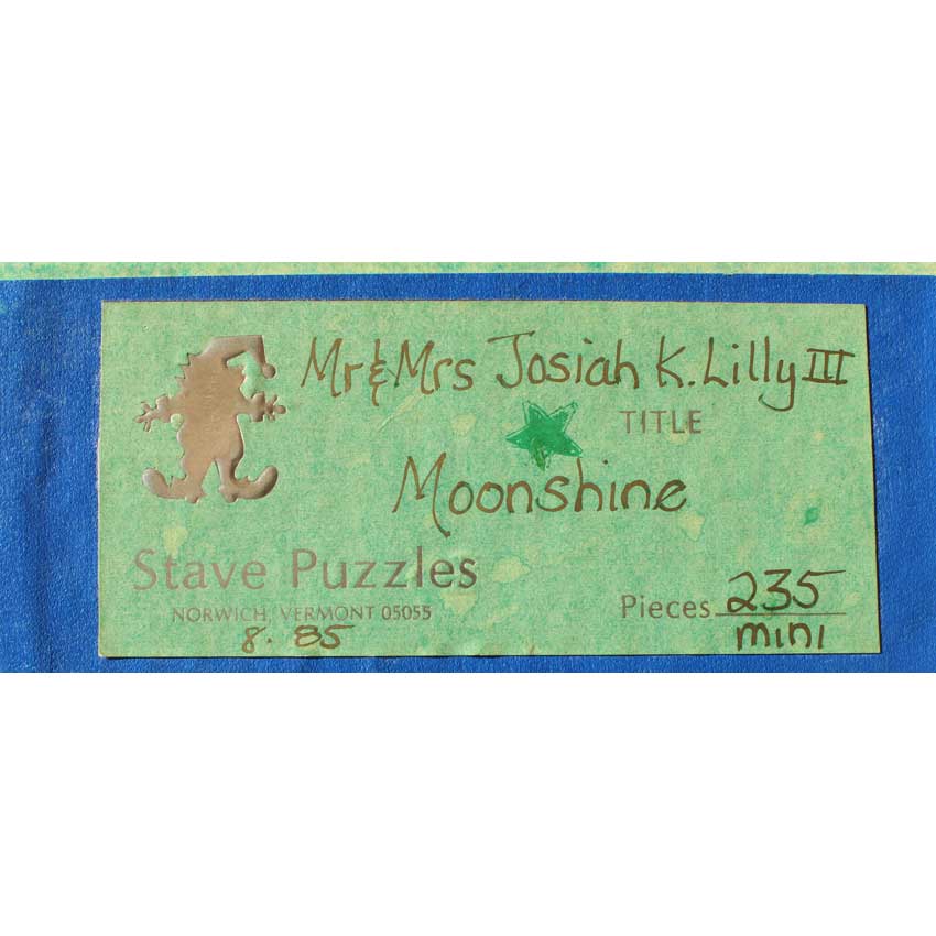 Good condition: 1 piece is chipped and 1 piece has been repaired. Some wear on a some pieces. Note: This is most likely not the right lid. The piece count is much higher and puzzle was cut in ’86 according to the Jester date. 4 personal pieces (1 x name, 3 x initials). Tissue paper covering silhouette layer has been replaced.