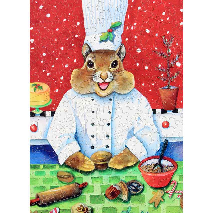 You’ll be hard pressed to find a cuter Xmas puzzle than this. Super bright colors, fun silhouettes, but best of all that chipmunk (or is it a squirrel?) standing in the middle. You can use your imagination if he’s presenting a tv show, working in a bakery or just at home baking!