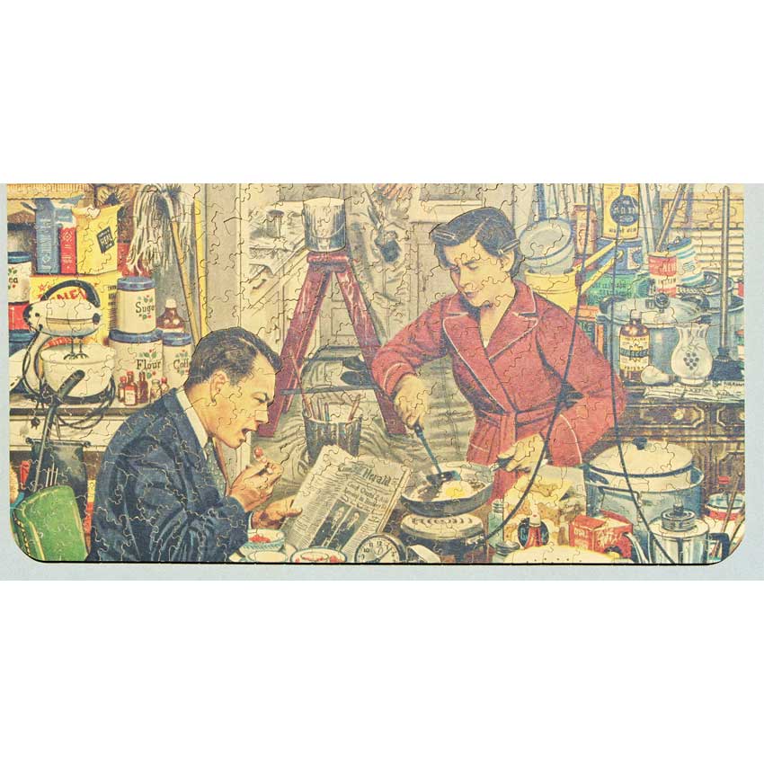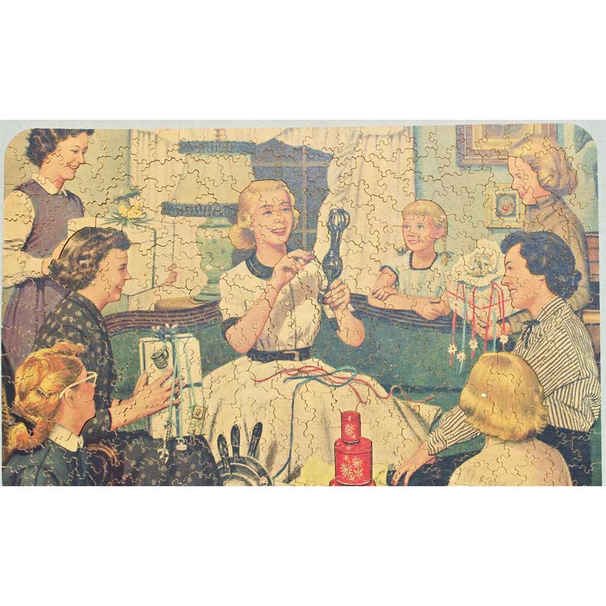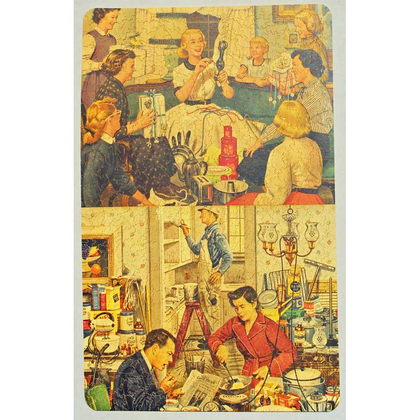 This was a fairly tough Par together. It is quite an unusual image, in that it appears 2 separate pieces of art were put together. They were both from the same artist, the top image is entitled “The Bridal Shower” and the bottom “Home Improvement”. He was known for his Saturday Evening Post covers, with a similar style to Rockwell. The juxtaposition in the puzzle reminds us of 2 very different stages in life between the 2 apartment scenes.