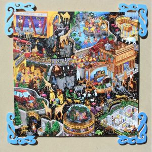 ~185 pcs ~17 silhouettes ~16 ½” x 5” 2010 Bill Bell is known for his whimsical art, and he doesn’t disappoint with this really fun puzzle. Without counting, can you guess how many different animals are represented and name them all? A very wide and short puzzle with amazing silhouettes, this puzzle has it all! … Continued