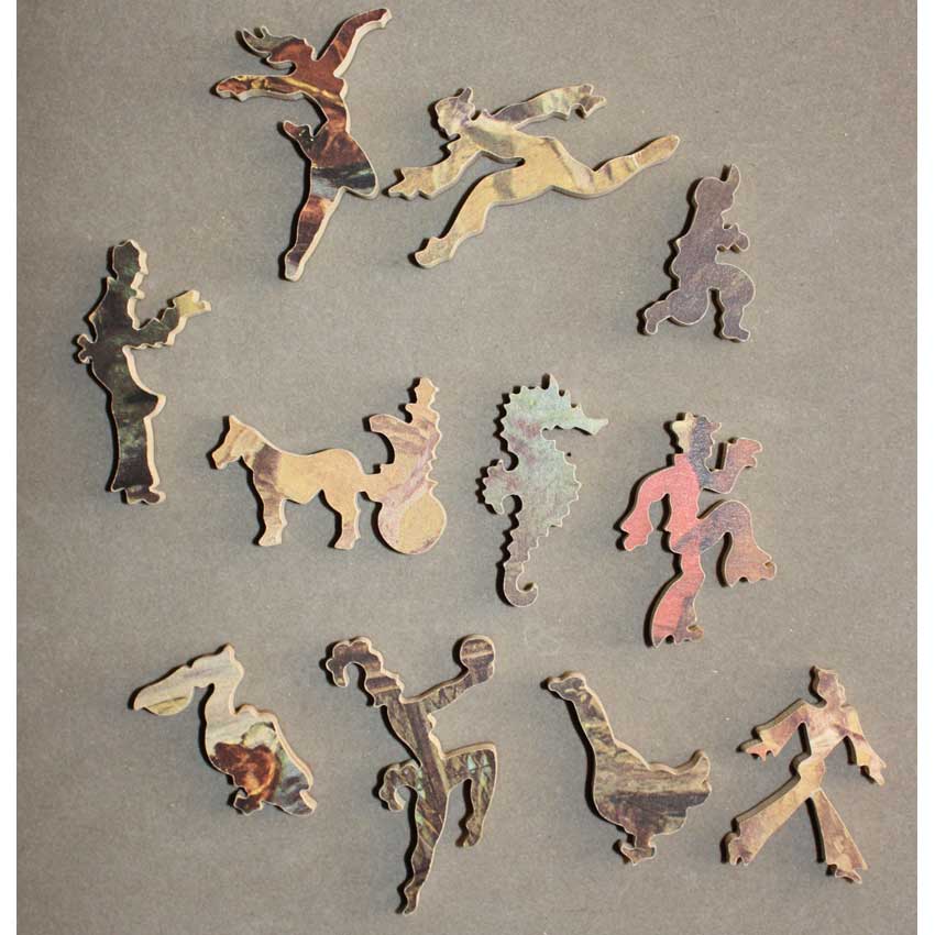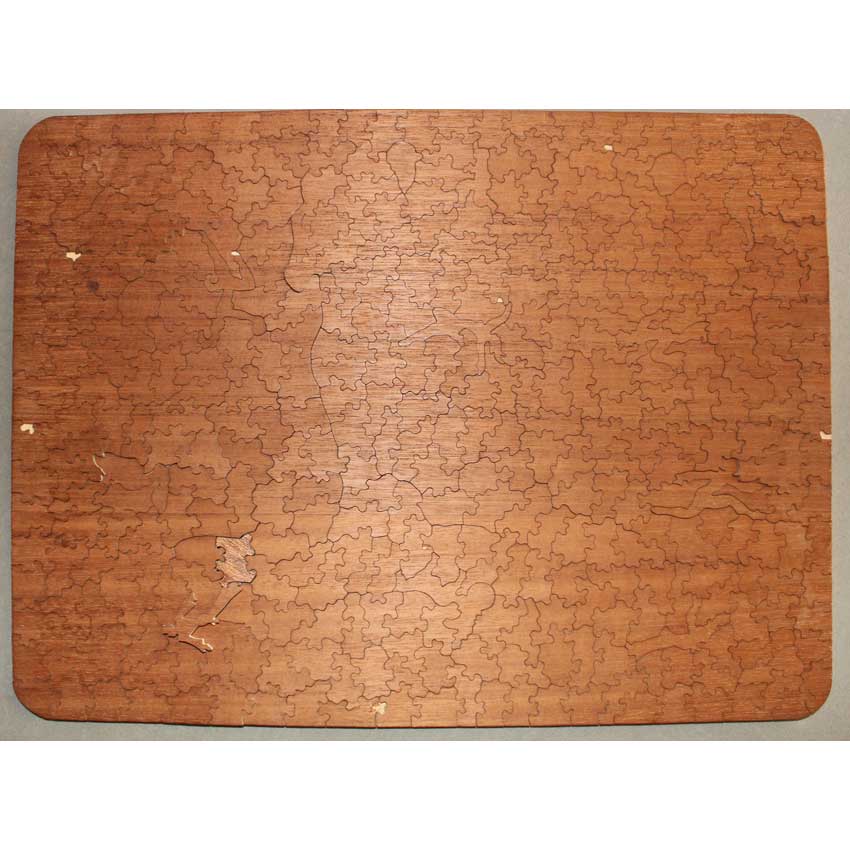 This puzzle has a number of condition issues and would be a good restoration project – priced accordingly: 1) 1 replacement piece that is of so-so quality 2) 2 repaired pieces 3) 2 pieces stuck together 4) Overall the puzzle has a very tight fit, possibly due to moisture at some point 5) Noted some delamination may be taking place, 1 was repaired. 6) A few chipped knobs