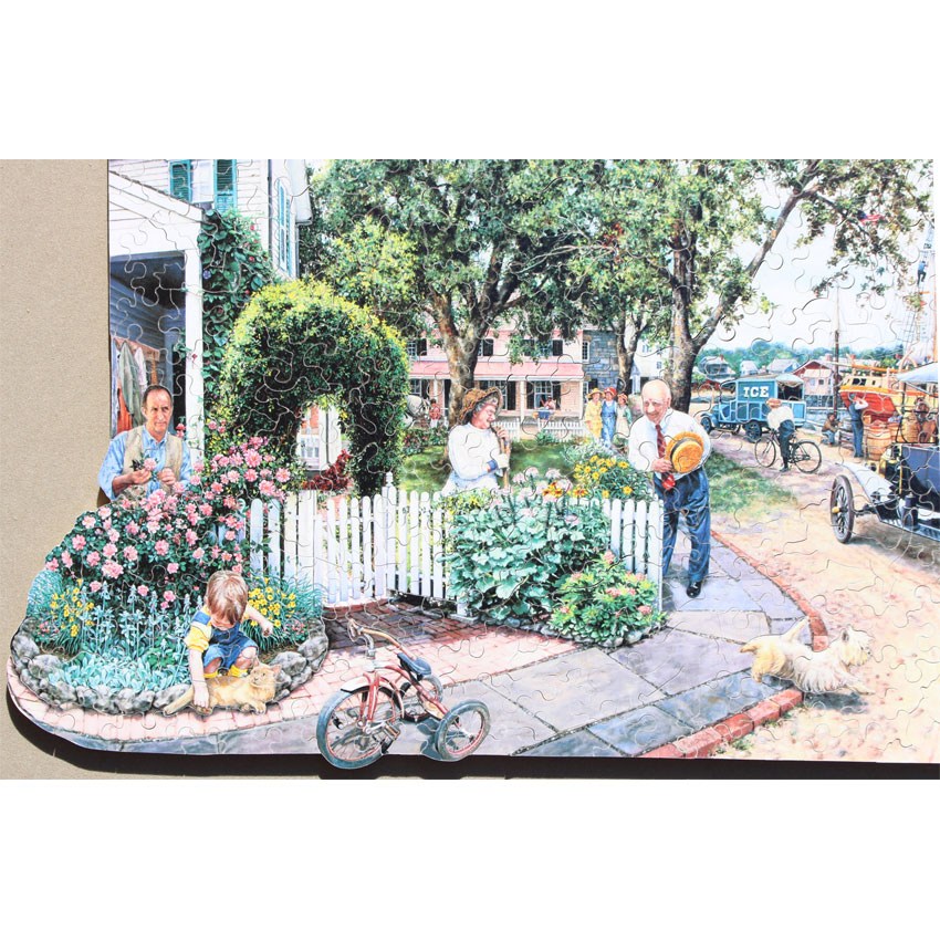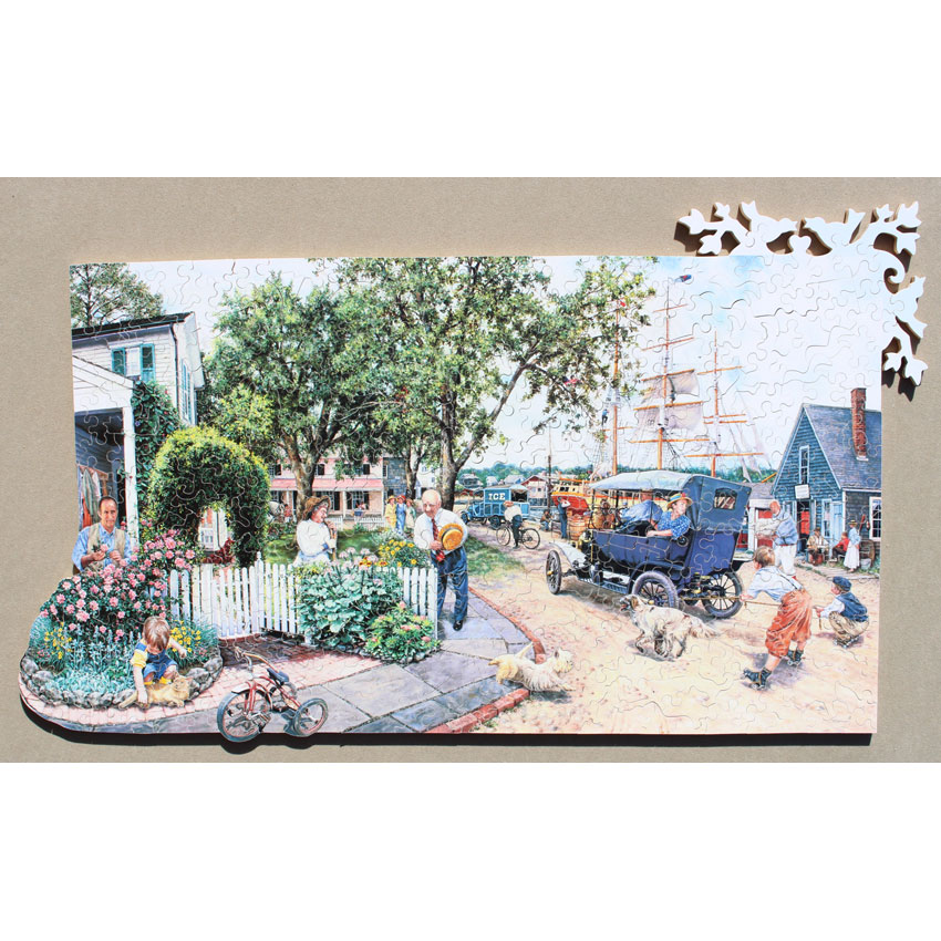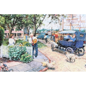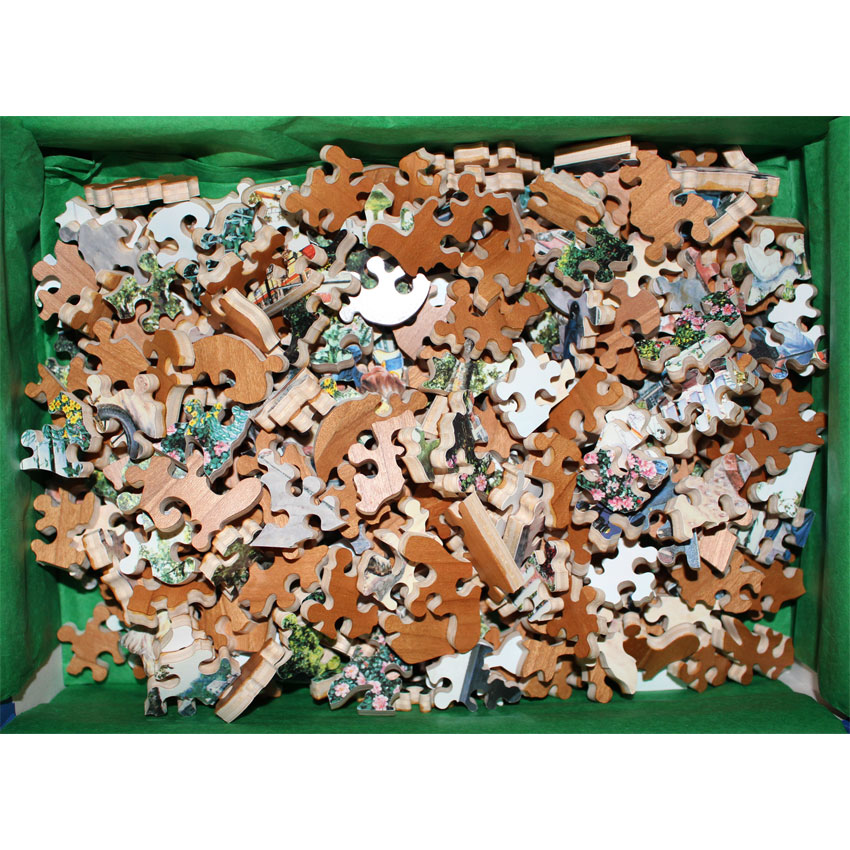 What strikes us about this puzzle is the very unusual style of the painting. The various characters in the image almost appear to jump out of the puzzle in a 3D-like fashion. A very interesting puzzle to put together with some nice irregular edge components as well.