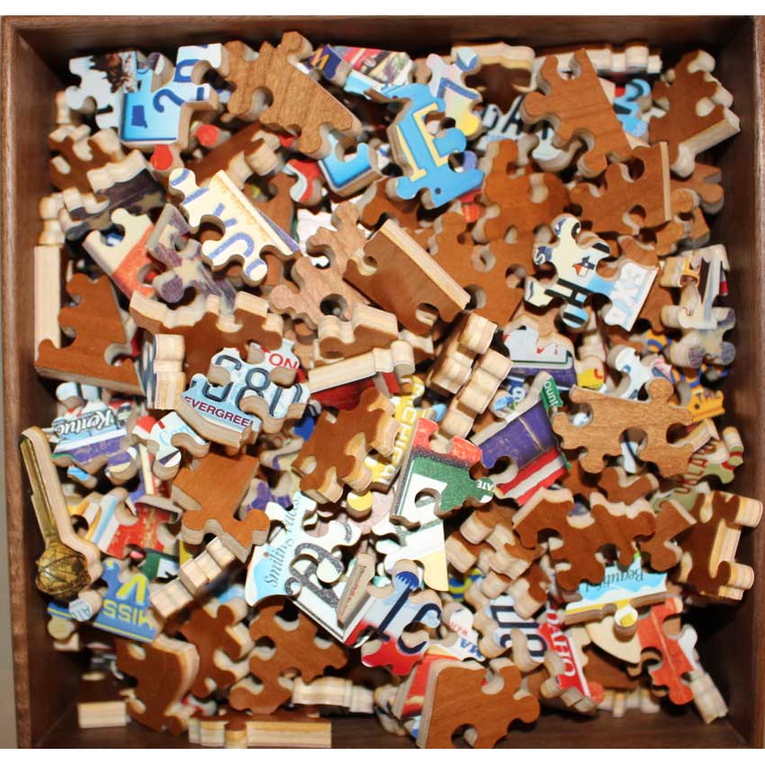 This is the first time coming across this puzzle and what a treat it is, a bit tough but a lot of fun. Can you find your state’s plate? We love the irregular edge too! Bonus: Comes in a Stave wood box that sells for $495 new alone. A rare chance to get one of these boxes as we don’t see them very often.