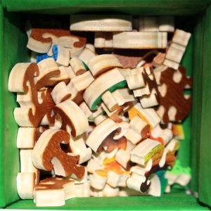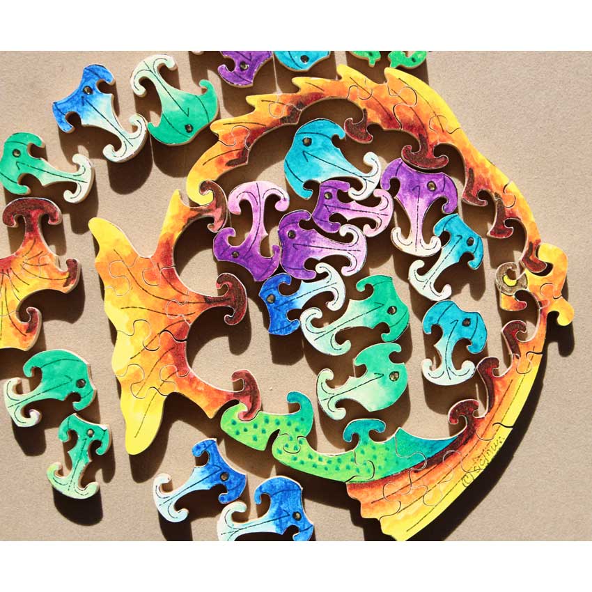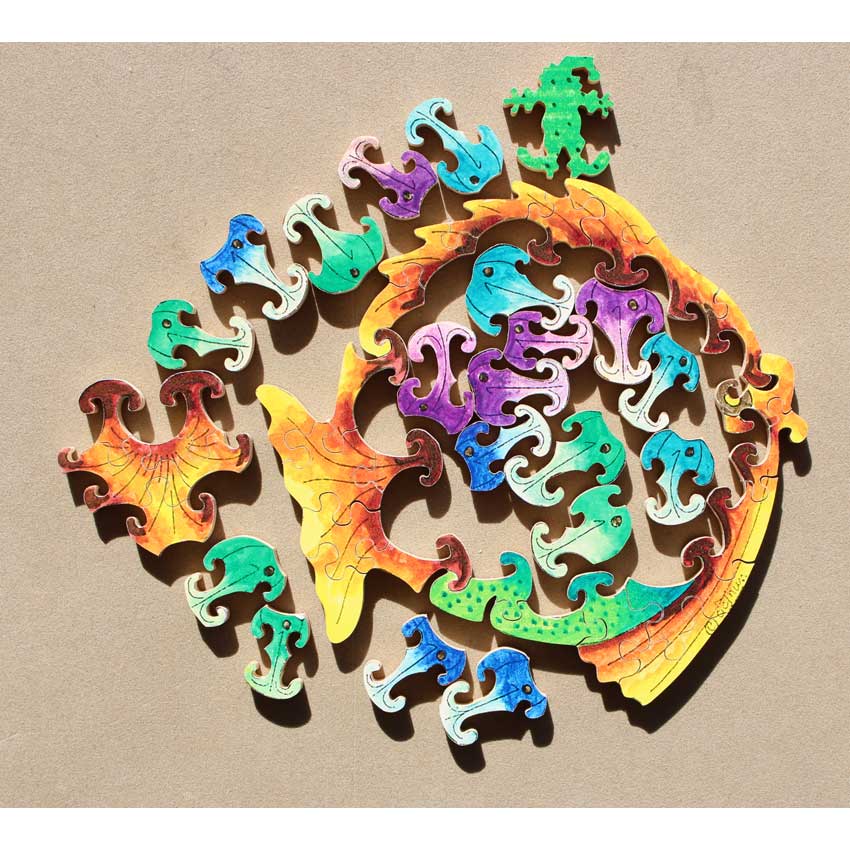 This is an earlier version of a classic timeless Teaser in the green Stave box. We have had several of these over the years and always enjoy the bright colors and shapes. The design of the way the fish fit together is extraordinary.