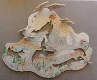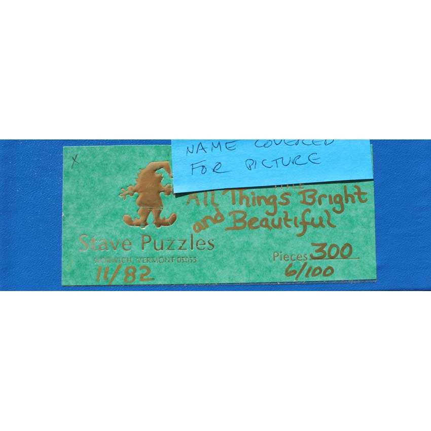 Excellent condition. 3 personal pieces (initials, 2 x word split into 2 pieces). The number 4 on puzzle and label. Lid is a little indented on one side. The “s” in one word had a minor repair. Note there is one missing 3D standup piece, which is a small shell. If you wanted it replaced, we can refer you to someone that may be able to help (or Stave might be able to as well).