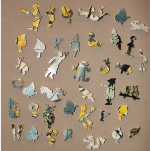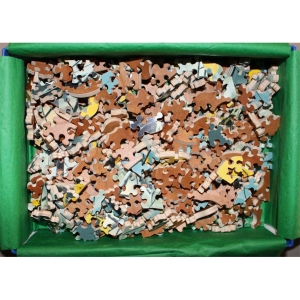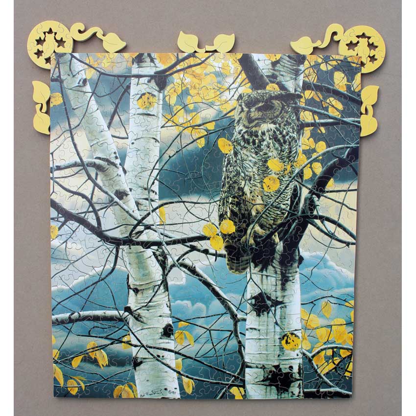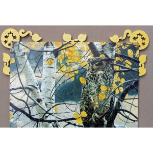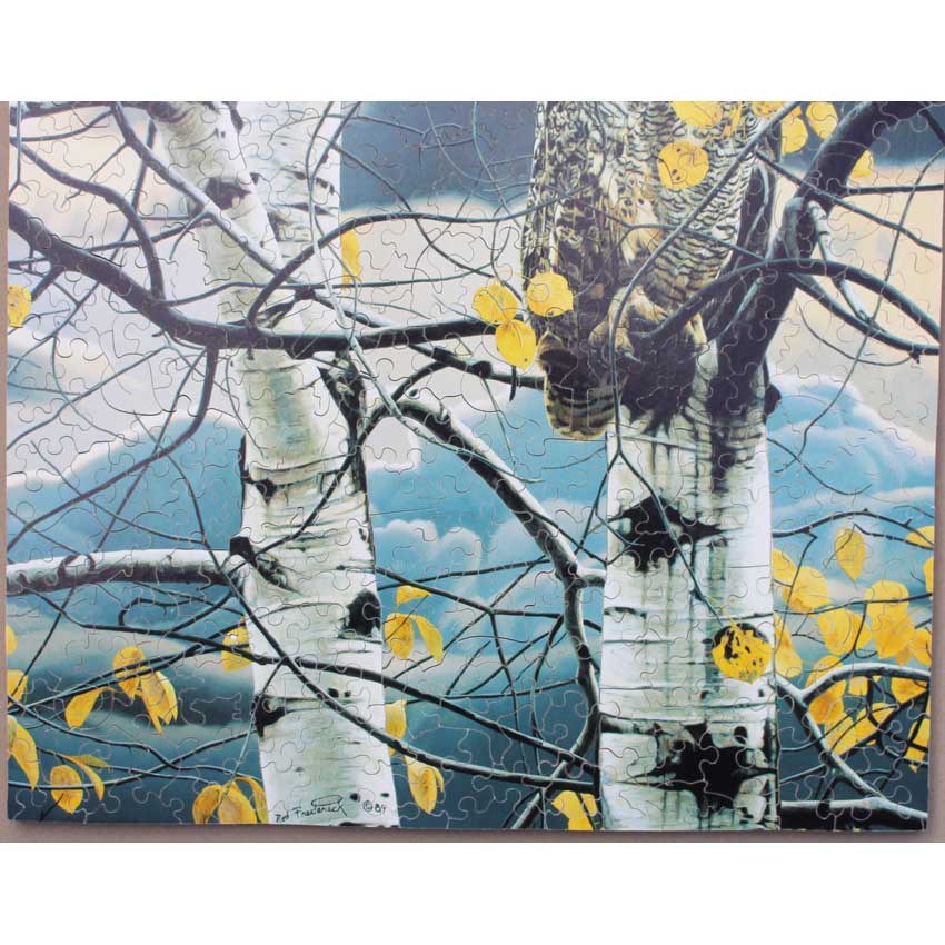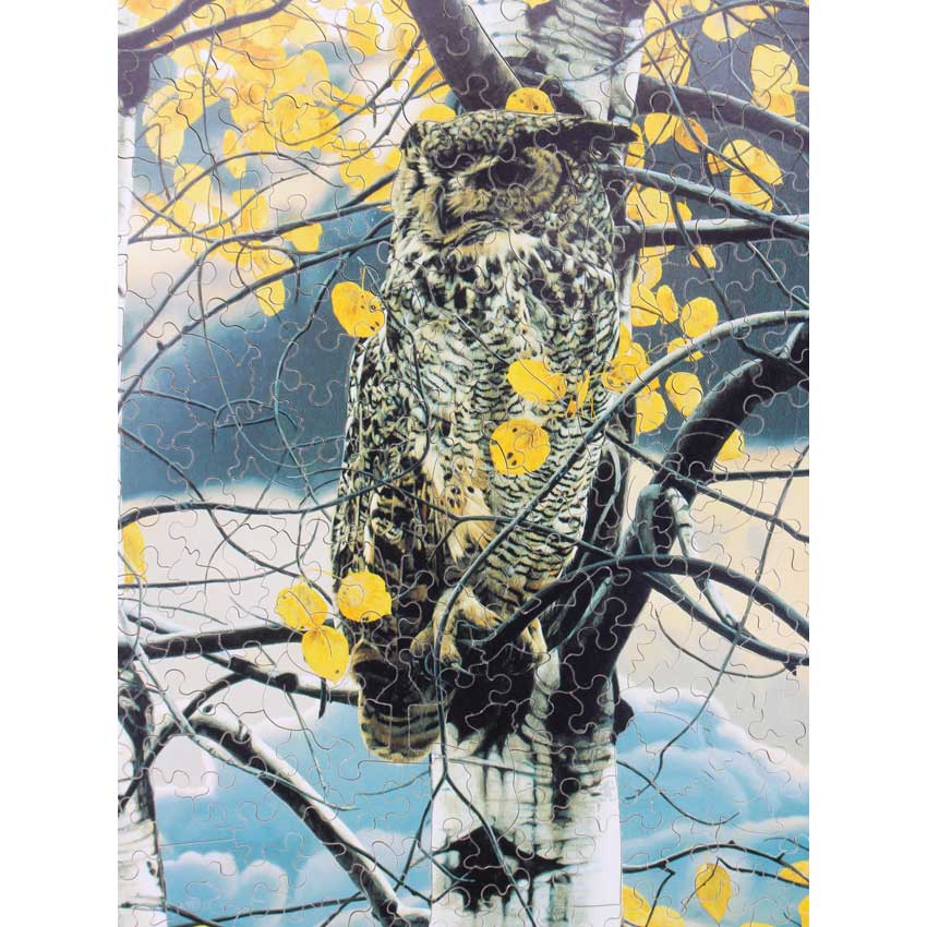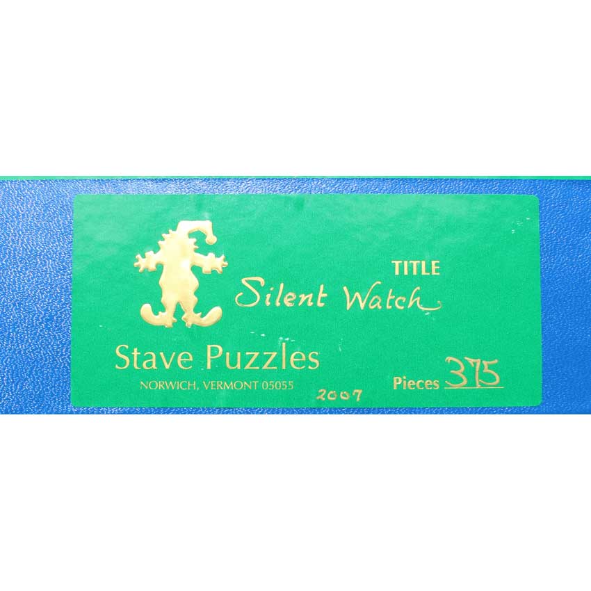 A gorgeous puzzle and image. The title is so fitting, you can just feel this owl waiting patiently and keeping an eye on the forest. Great corner edge cuts and some nice themed silhouettes round us that is amazing Stave. Bonus: Comes with the original flyer.