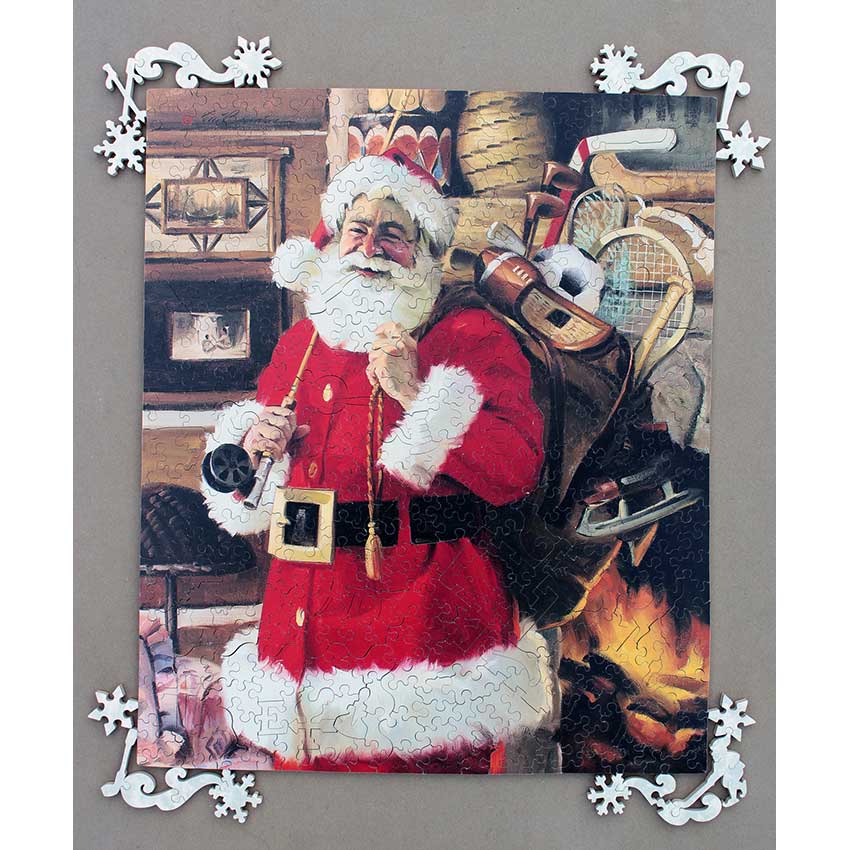 A fantastic holiday puzzle with irregular corners that are extremely elaborate. Santa may very well be the best athlete in the world somehow getting down all those chimneys in one night, without anyone finding him. A cute image and a great cut.