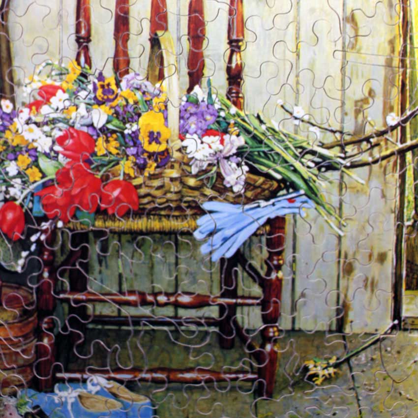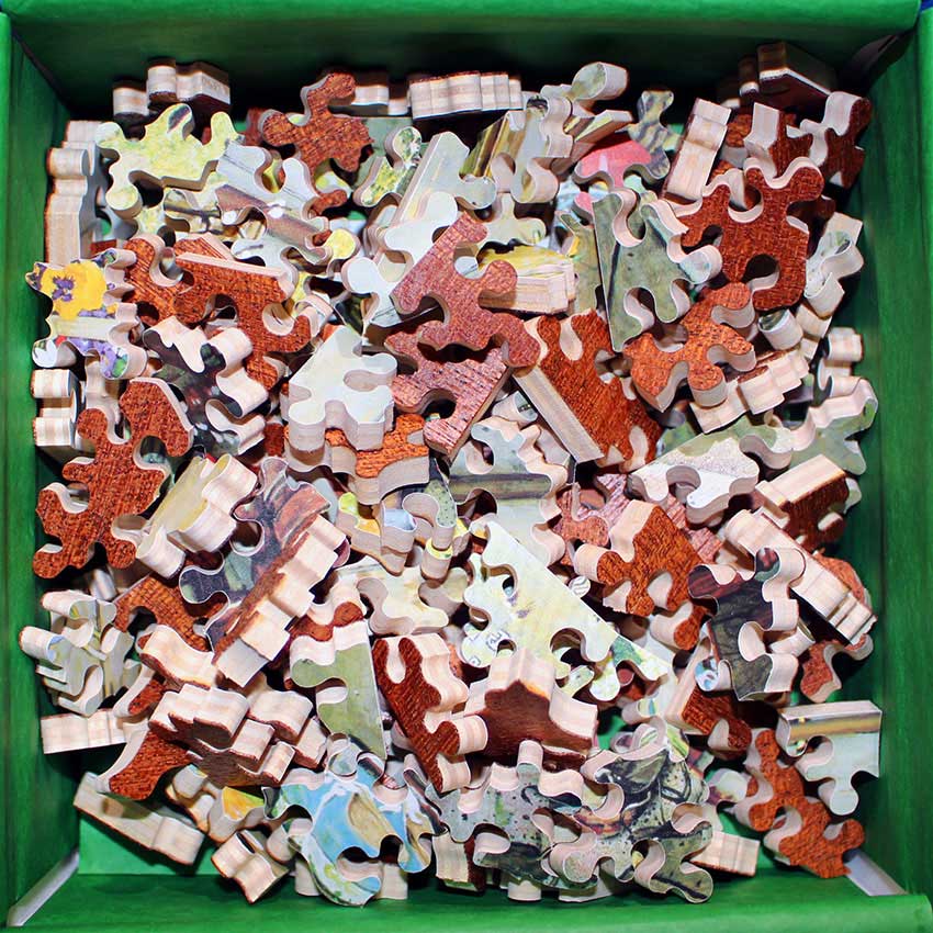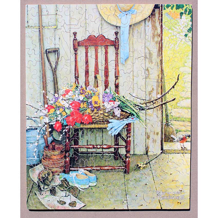 Not your typical Rockwell, this feels more like a still life with the addition of the curious bird. A few nice design features and the interesting color combine for an enjoyable puzzle.