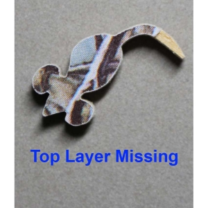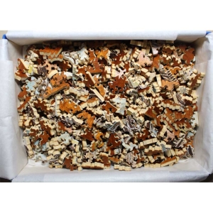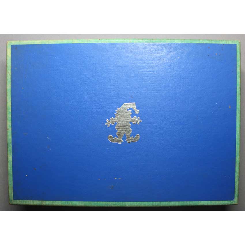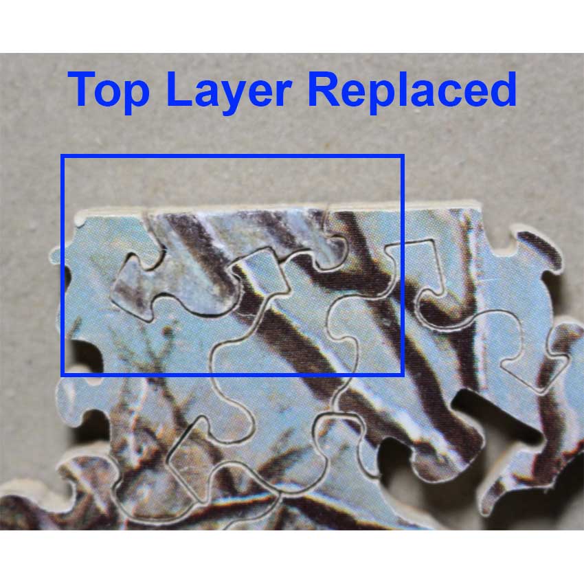 1) The puzzle did have some pieces that were delaminating, we repaired all that we could find. Based on a note inside the lid, it looks like this may be an early problem. It seems to be from when you pull the pieces apart in the wrong direction the top layer will get loose, so need to be careful when taking apart. 2) 1 piece is missing a little of the top layer (see pic) 3) Several pieces were professionally restored. 4) The tissue has been replaced 5) The lid has what looks like caked on dirt specks in a few pieces. It looks like it had been taped closed at one point and the dirt seems to have accumulated where the stick part of the tape was as well as a few other places, although not 100% it’s dirt, hard to tell. IF YOU WOULD LIKE WE CAN INCLUDE A BRAND NEW BOX REPLACEMENT STAVE BOX LID (SEE PIC) GIVEN AS A REPLACEMENT 5) some small chips on the back
