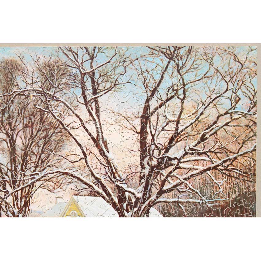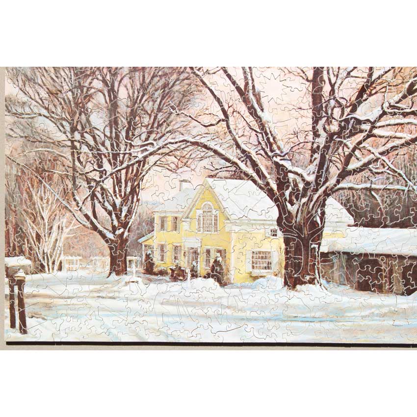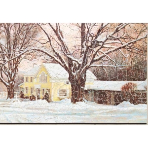 A chance to own another great puzzle from the Lilly Collection. This one unusual for 2 reasons. First, it is a mini-puzzle, which we don’t see too often. These were puzzles Stave sold that were had smaller pieces than the traditional size. Probably about 1/2 the size or so of standard pieces. Second, which we have never seen on a mini that we can recall, is it is a fantasy cut. Fantasy cuts are not very common and are identified by a lot of the knobs in a arrow like shape. They are fun to do. With regards to the image, a great winter scene that is no walk in the park to solve.