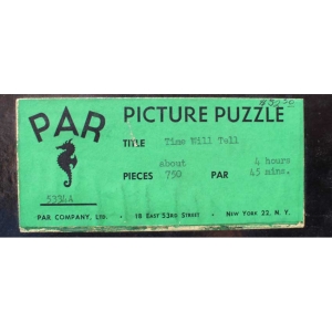 In pretty good condition. There are a small number of pieces that have had a small amount of paper rubbed off, mostly over the knobs. One silhouette looks like it was colored partially with paint (see pic) and there are 2-3 knobs with very small chips. 1 replaced piece (the chewed piece that was replaced is including separately in the box). Other than a little wear from being worked over the years, we did notice one chip on a knob on the back. Box is a little worn, but still structurally ok.