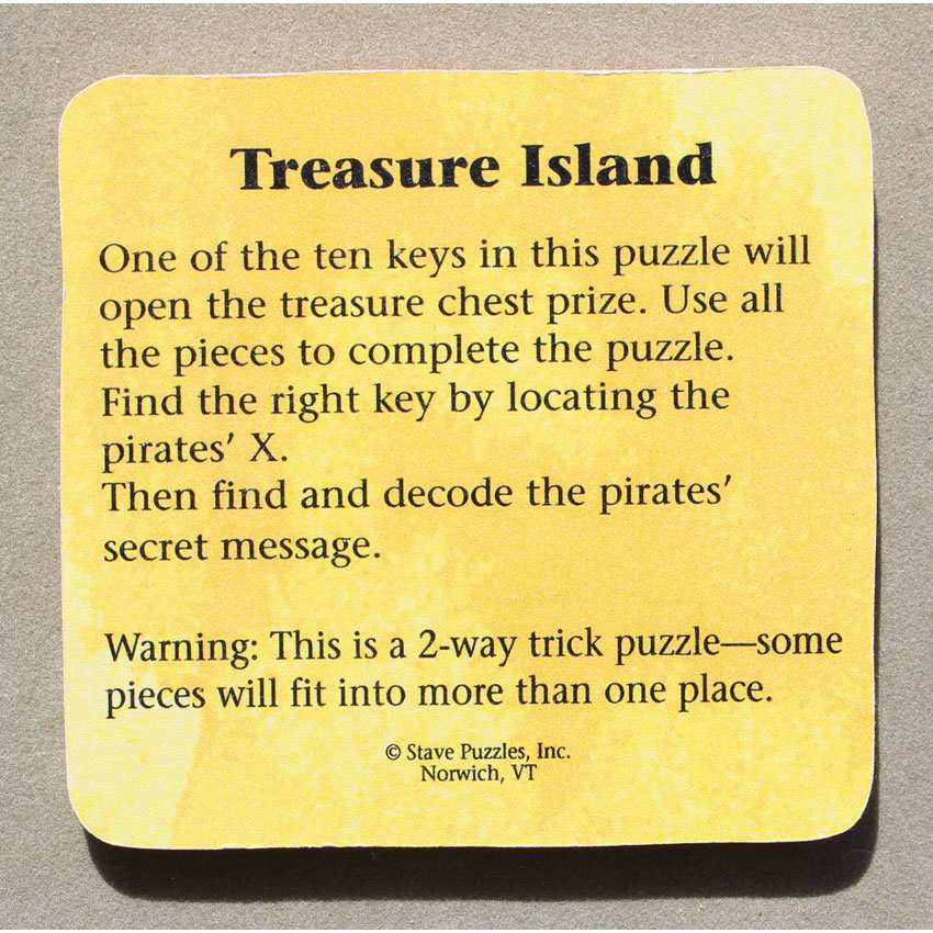 NOTE: Unfortunately, this is missing the treasure chest that is originally came with it. The goal of the puzzle is to ID a key which opens the treasure chest and has a message inside of it. This has zero impact on the puzzle or solving it, you just won’t read the message on the paper (which we can tell you what it is if you’d like). We do have pictures of a different chest, what it looks like when it is opened and a message that was on the outside that we can provide photos of if you’d like. We are sure what originally was inside, but, again, it can be solved without the chest, it’s sort of like a bonus feature.