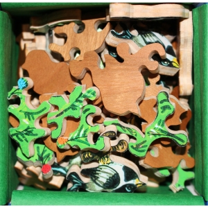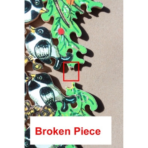 Except for damage noted, other pieces in excellent condition. One partly broken piece (see red squares). It does not impact the Teaser solution at all and is probably only about a 1/4-1/2″ little knob-like piece that seems to have broke. Note that the box lid has some damage on all 3 corners too as shown in the photos.