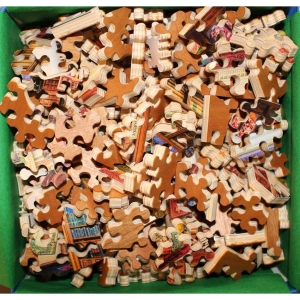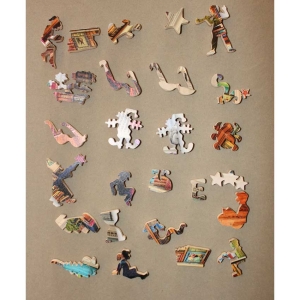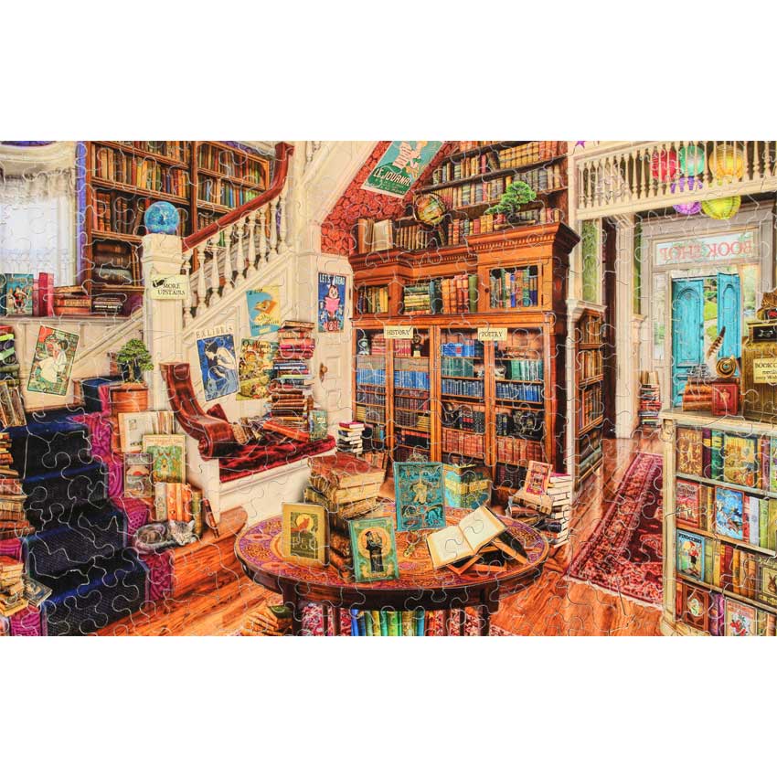 So first, this Stave has something we do not recall every coming across before, there are 2 Jester pieces. We don’t know if this was a mistake, a “little surprise” or what, but a very rare puzzle cut. Second, the edge cut on this puzzle is extraordinary. The very clever image is a bookshop that is inside a book. Stave took it to the next level and cut the edge to really make it feel like it’s a book too. A really exceptional puzzle to consider for your collection.