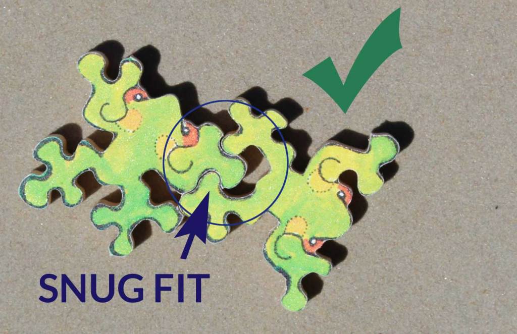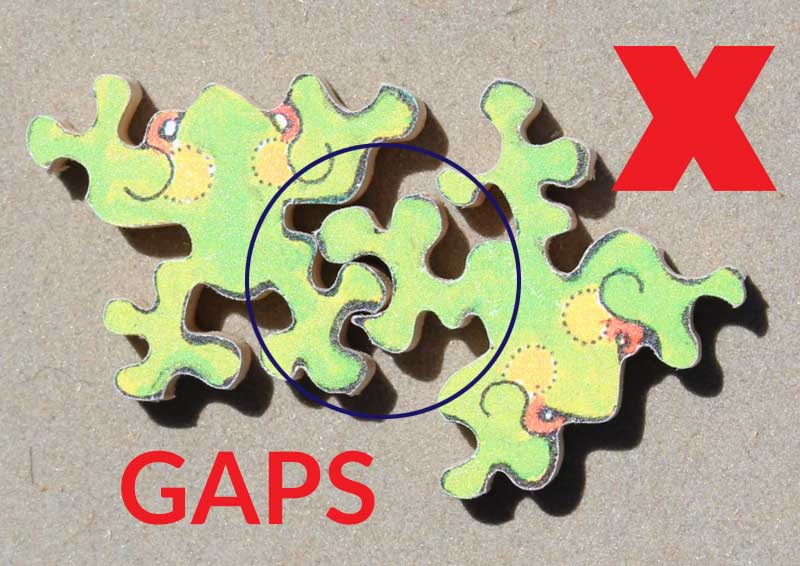 4. Not Your Grandma’s Pieces. The pieces don’t fit together in the normal interlocking way. When you have correctly connected 2 pieces, they fit together snugly. However, if you have to ask yourself (or puzzle partner) “Do you think these fit together?” then they probably don’t. After getting a few pieces in, you will just know if it’s a fit or not. Here is an example of the right and wrong way to connect Teaser pieces.