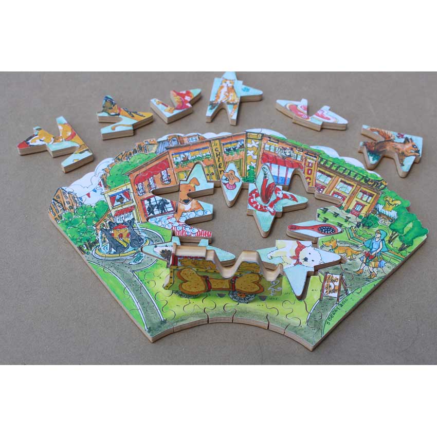 What sets this apart from most other Stave Puzzles as they seem to have been modeled off of push-fit puzzles in that they have no knobs for connecting the pieces. While there are some modern puzzles you may be able to find today, push-fits were a style of puzzle you often saw around the turn of the 20th century. They don’t have knobs, so it makes them a lot harder to assemble, and often were just cut in a grid pattern, so you were stuck with a lot of square pieces. (One thing you learn quickly when doing push-fits is never bump the table or all your hard work quickly gets spread out!)