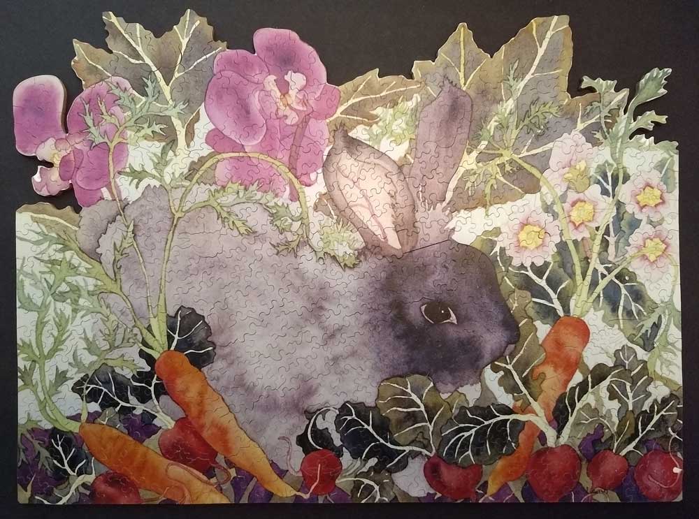 A great springtime puzzle. Who can resist that cute bunny chomping on carrots? Nice irregular edge as well.