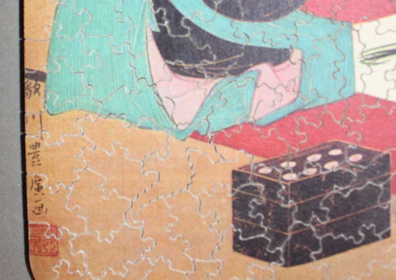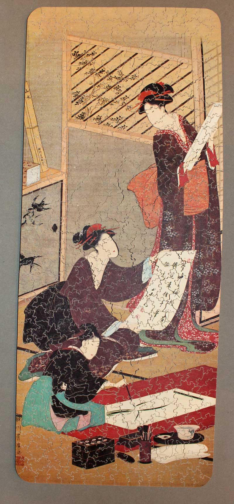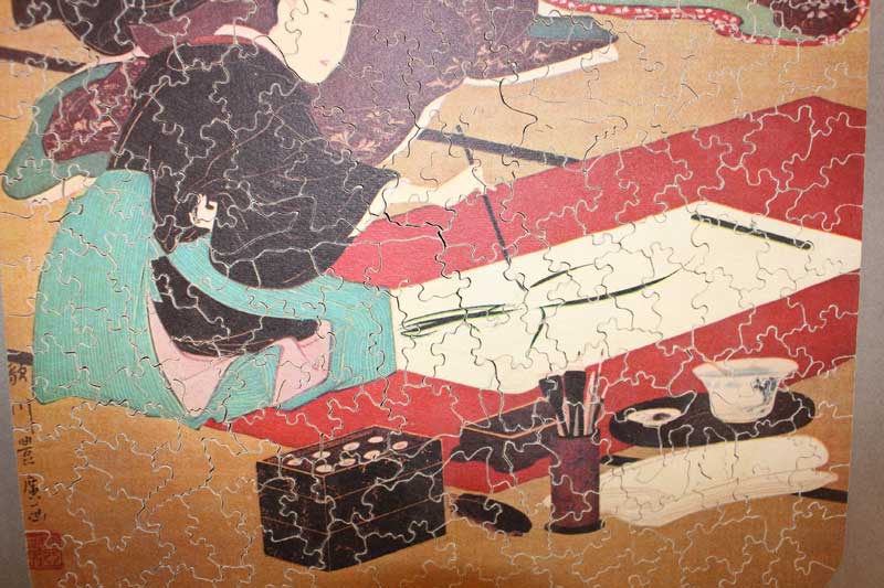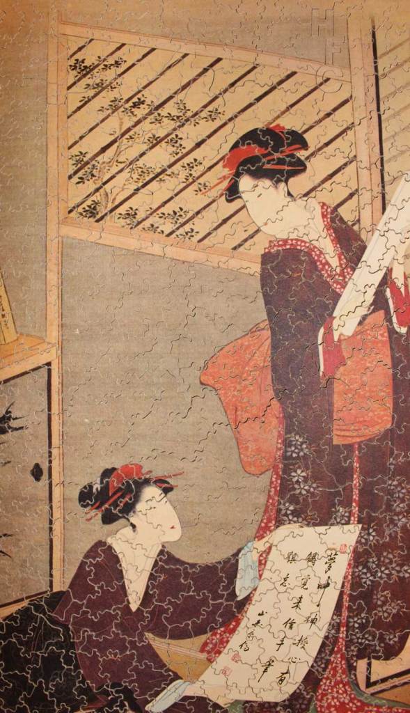 A very tall puzzle! The artist is Utagawa Toyohiro and is entitled “The Four Accomplishments”. It is from the 1800s and currently is in the Smithsonian. This puzzle sas some great colors and the image is telling quite a story.