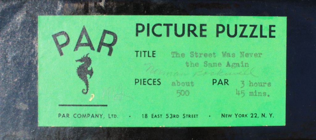 A cool Norman Rockwell print. We have seen other Pars by Rockwell involving cars, but not this one. Very bright colors and minimal wear. Perfect to add to any Par collection. Someone wrote 1962 on the label in pencil, so may be when purchased.