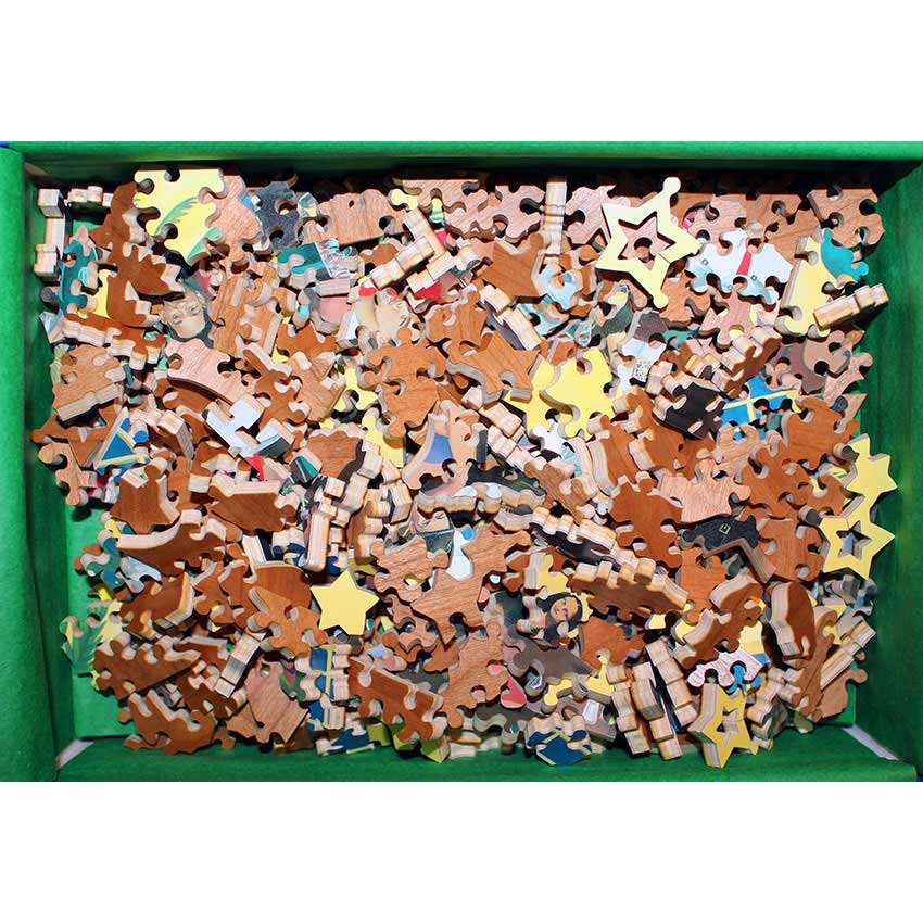 Good – Puzzle has been done a few times and there may be a number of pieces showing wear on their edges. The wood is in good structural condition, it’s mostly cosmetic issues with the paper layer being worn.