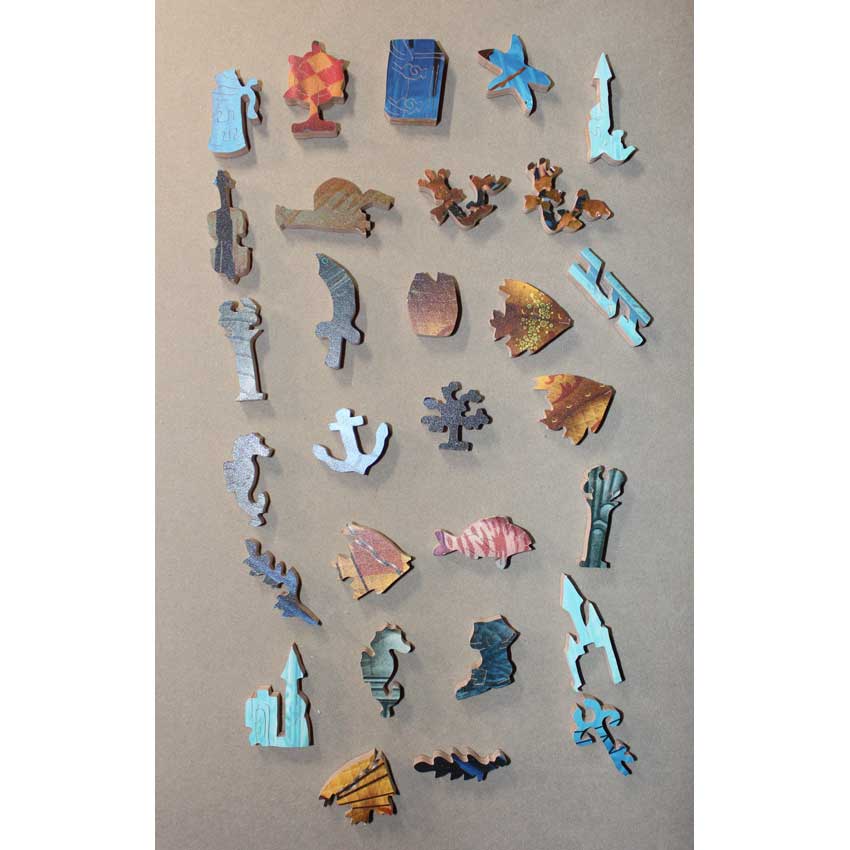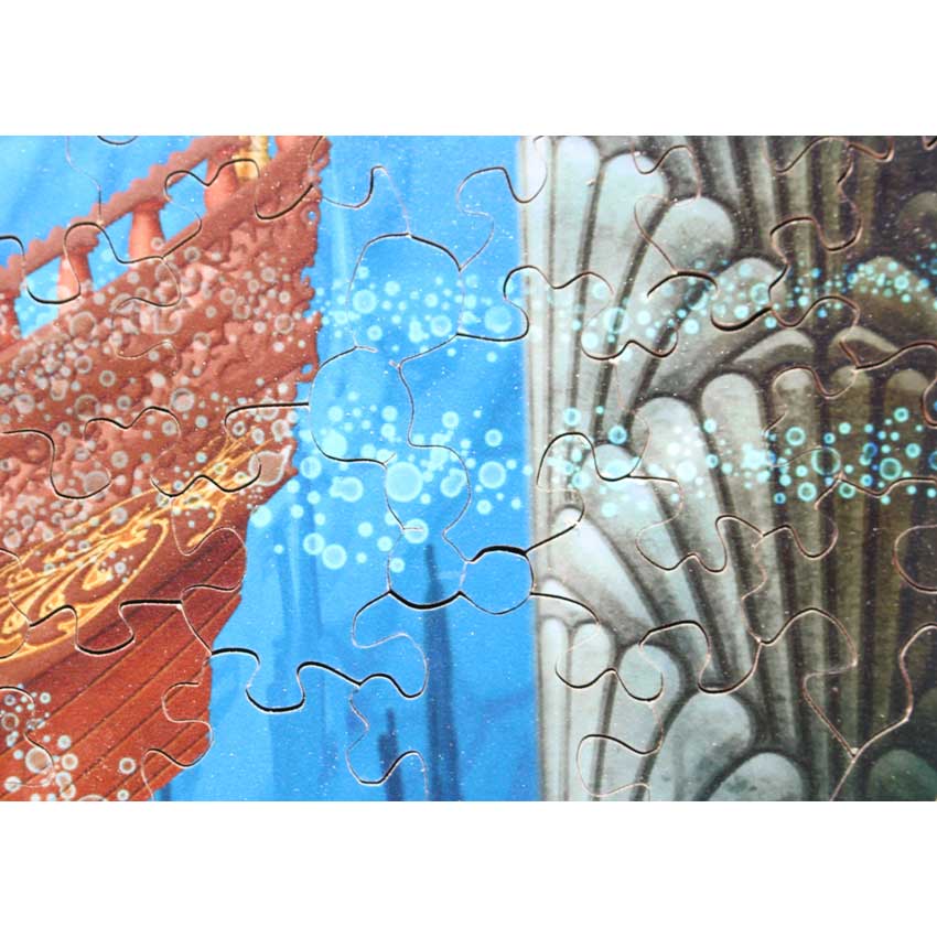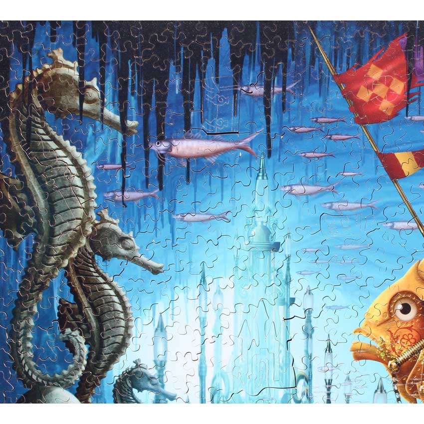 A very vibrant and interesting image. Some nice interacting silhouettes and other little nice cutting styles were used throughout this gorgeous puzzles. If you are a fan of James Christensen then you will love this puzzle as well, it is very much in his style with the surreal imagery and bright colors.