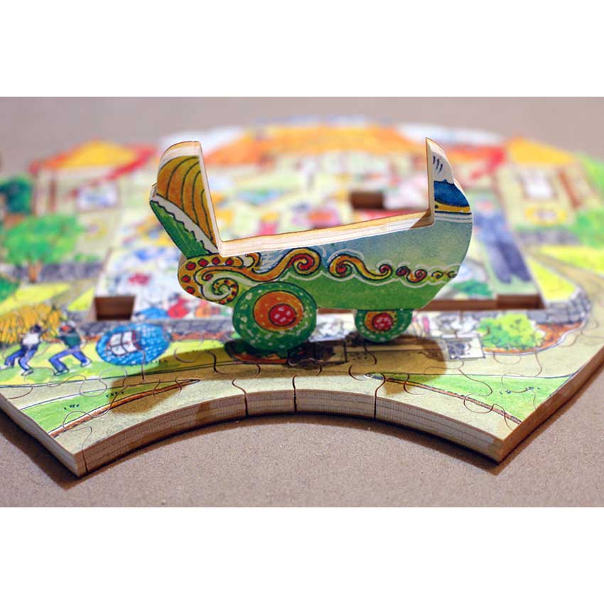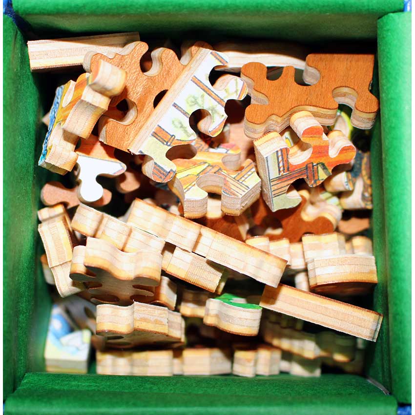 Good – Puzzle has been done a few times and there may be a number of pieces showing wear on their edges. The wood is in good structural condition, it’s mostly cosmetic issues with the paper layer being worn.