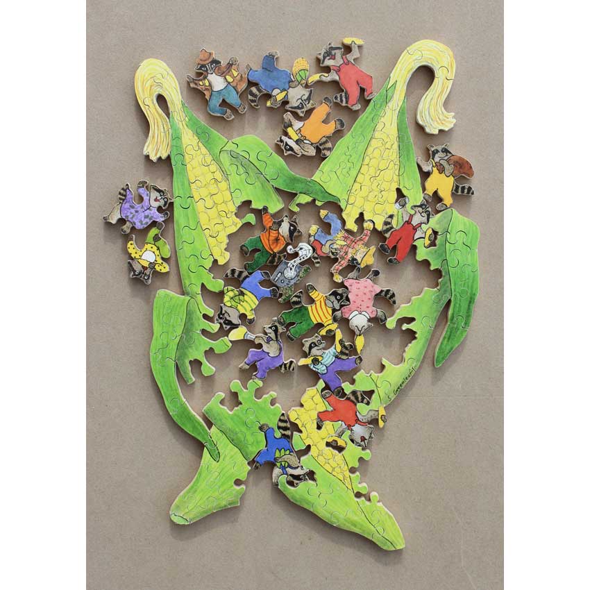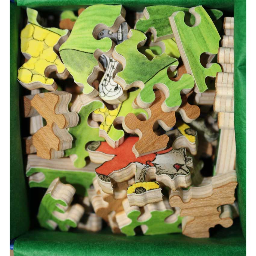 Good – Puzzle has been done a few times and there may be a number of pieces showing wear on their edges. The wood is in good structural condition, it’s mostly cosmetic issues with the paper layer being worn.