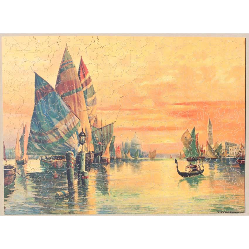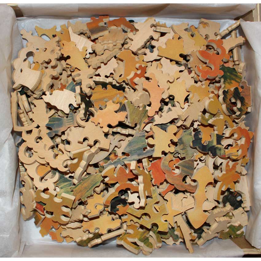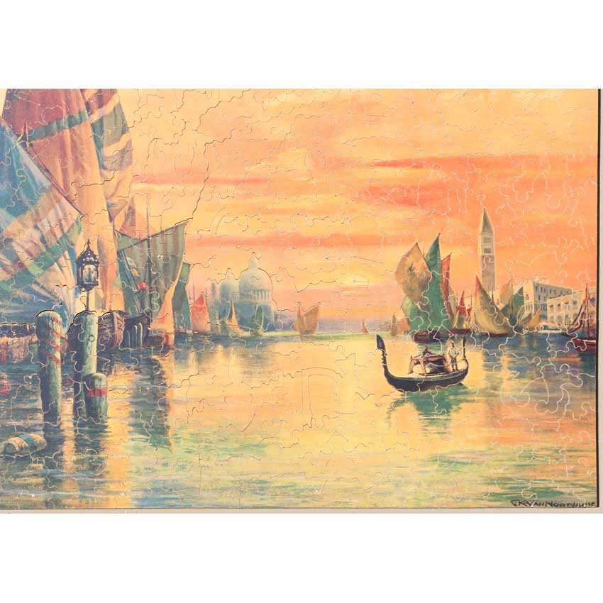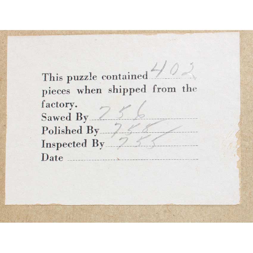Good – Puzzle has been done a few times and there may be a number of pieces showing wear on their edges.   The wood is in good structural condition, it’s mostly cosmetic issues with the paper layer being worn.
