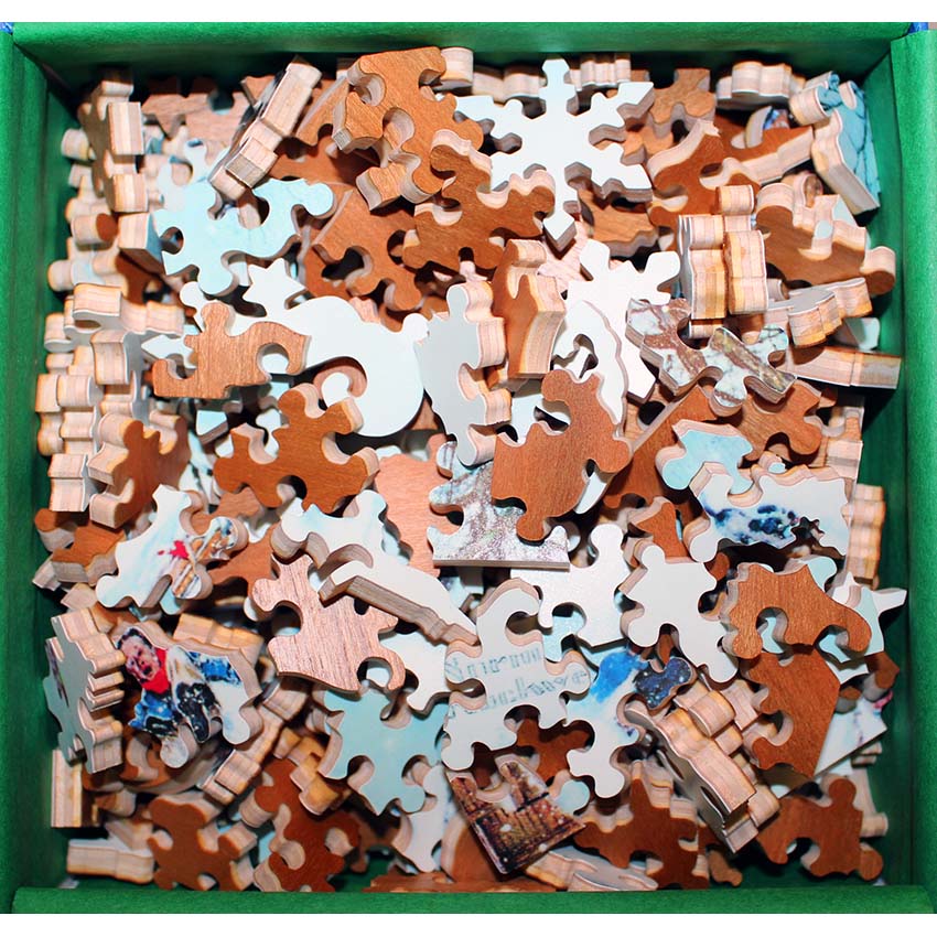 Good – Puzzle has been done a few times and there may be a number of pieces showing wear on their edges.   The wood is in good structural condition, it’s mostly cosmetic issues with the paper layer being worn.