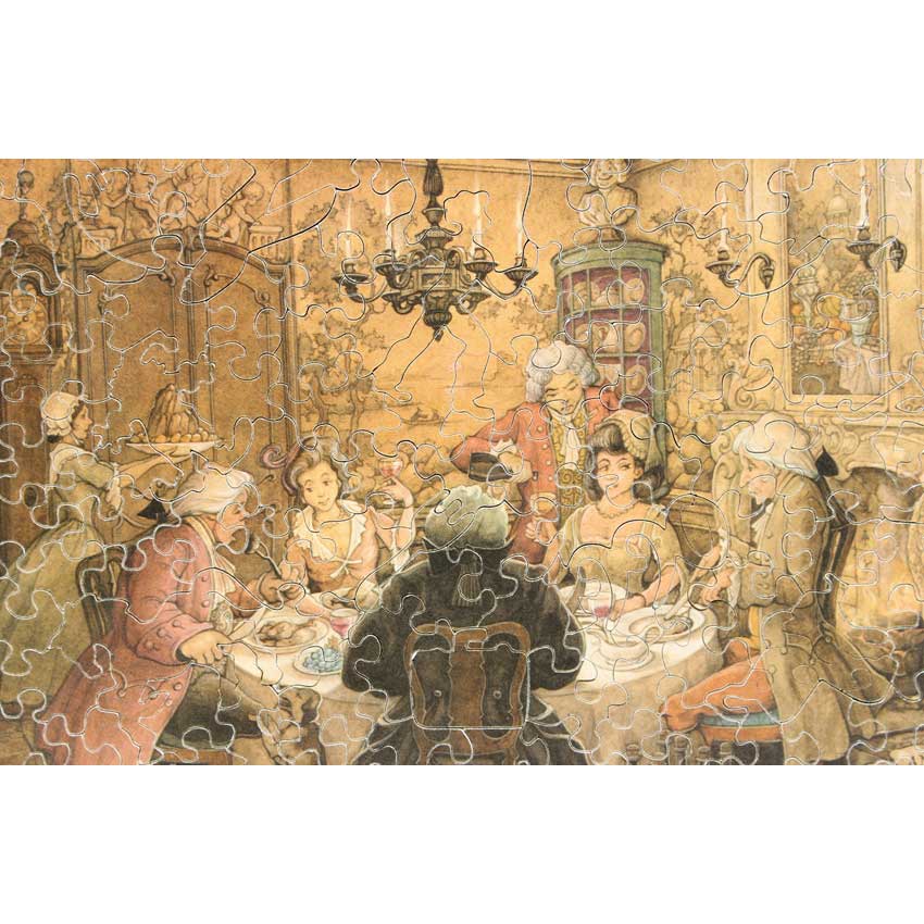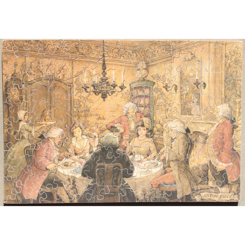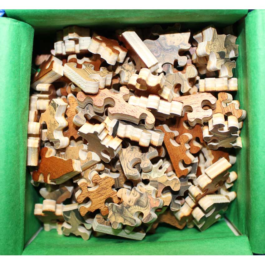 Good – Puzzle has been done a few times and there may be a number of pieces showing wear on their edges.  The wood is in good structural condition, it’s mostly cosmetic issues with the paper layer being worn.