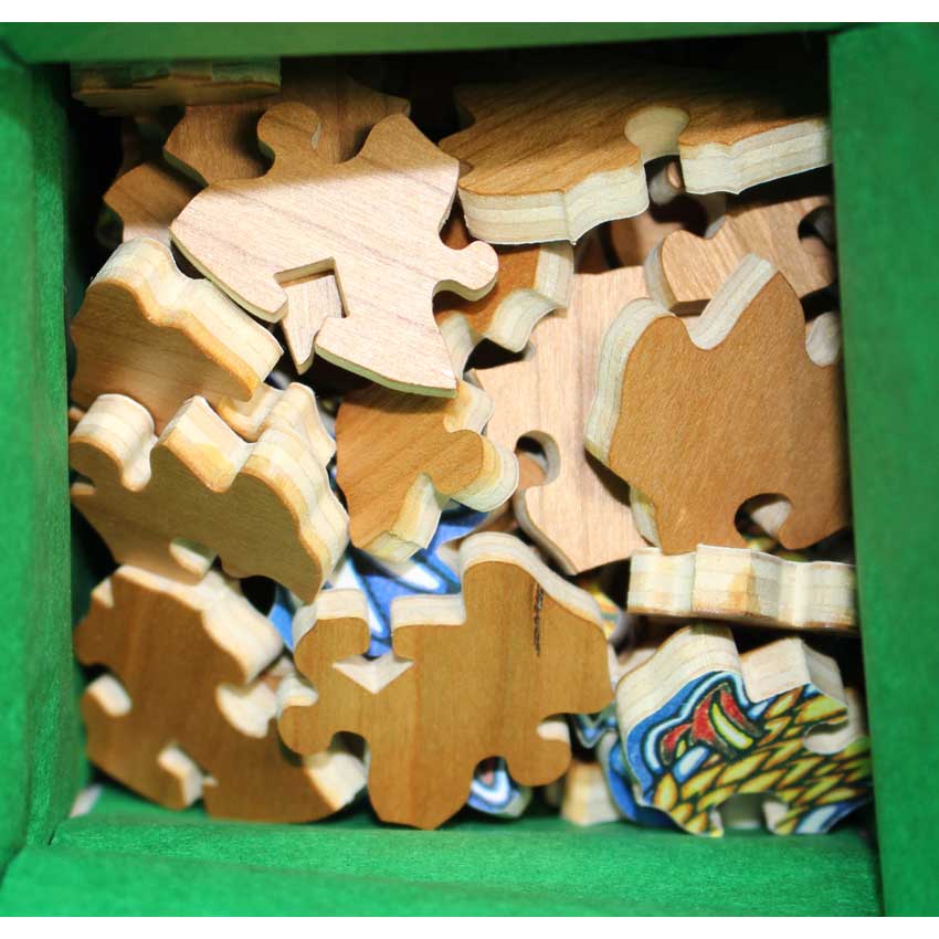 Good – Puzzle has been done a few times and there may be a number of pieces showing wear on their edges.   The wood is in good structural condition, it’s mostly cosmetic issues with the paper layer being worn.
