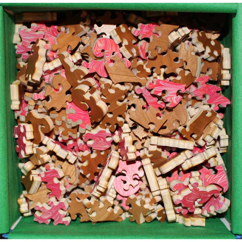 Good – Puzzle has been done a few times and there may be a number of pieces showing wear on their edges.   The wood is in good structural condition, it’s mostly cosmetic issues with the paper layer being worn.