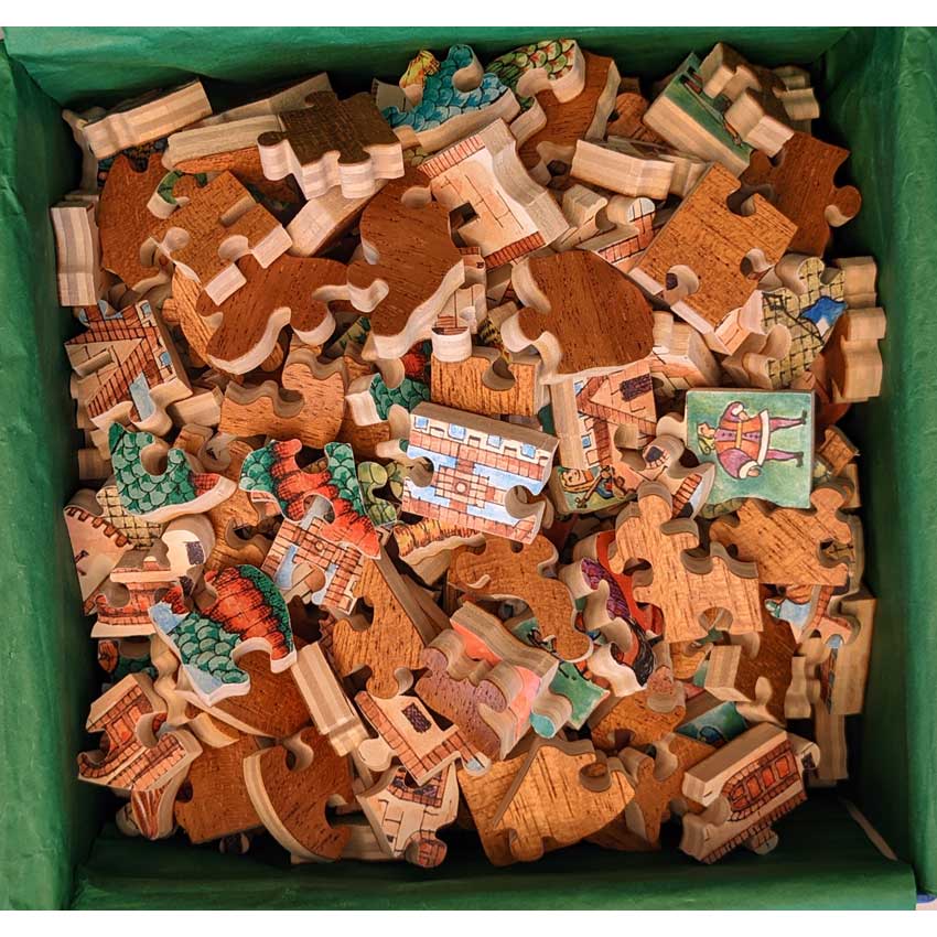 Good – Puzzle has been done a few times and there may be a number of pieces showing wear on their edges.   The wood is in good structural condition, it’s mostly cosmetic issues with the paper layer being worn.