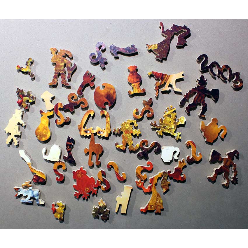 Good – Puzzle has been done a few times and there may be a number of pieces showing wear on their edges. The wood is in good structural condition, it’s mostly cosmetic issues with the paper layer being worn.