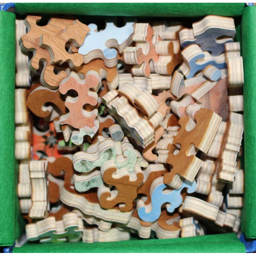 Good – Puzzle has been done a few times and there may be a number of pieces showing wear on their edges.   The wood is in good structural condition, it’s mostly cosmetic issues with the paper layer being worn.
