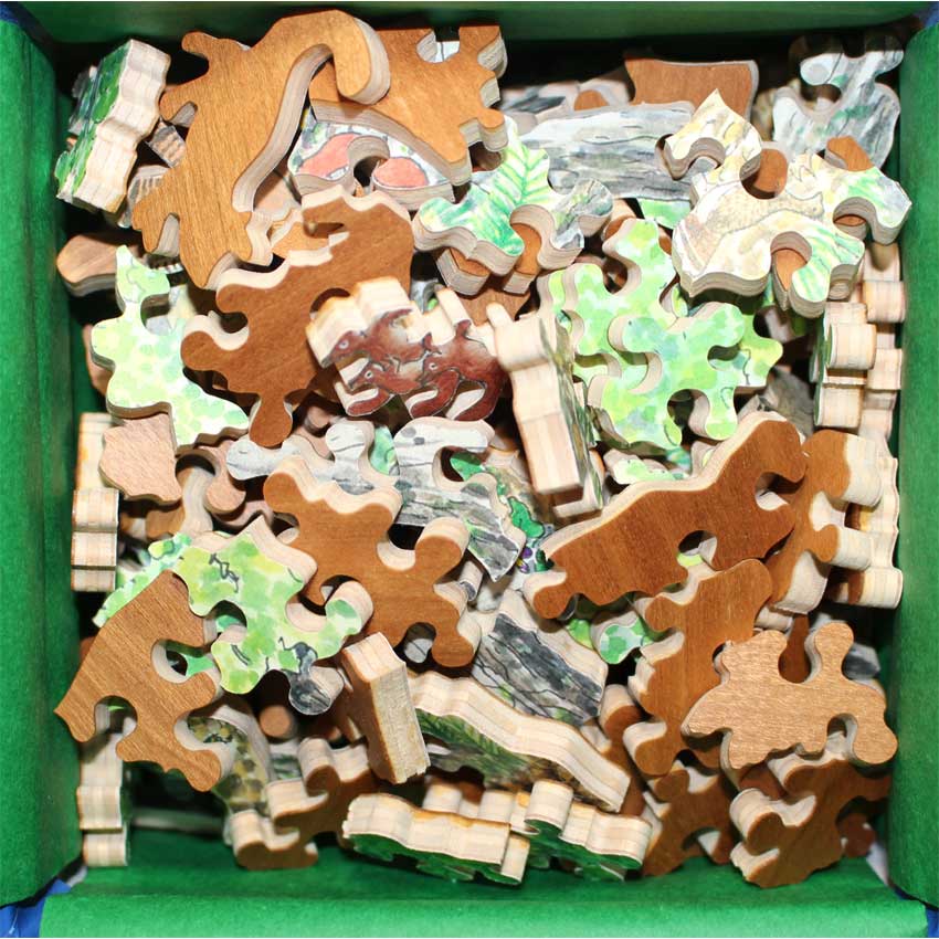 Good – Puzzle has been done a few times and there may be a number of pieces showing wear on their edges.   The wood is in good structural condition, it’s mostly cosmetic issues with the paper layer being worn.
