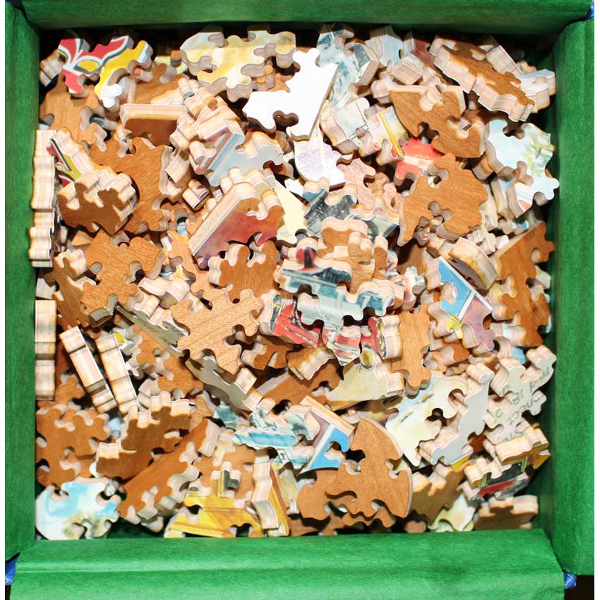 Good – Puzzle has been done a few times and there may be a number of pieces showing wear on their edges.   The wood is in good structural condition, it’s mostly cosmetic issues with the paper layer being worn.