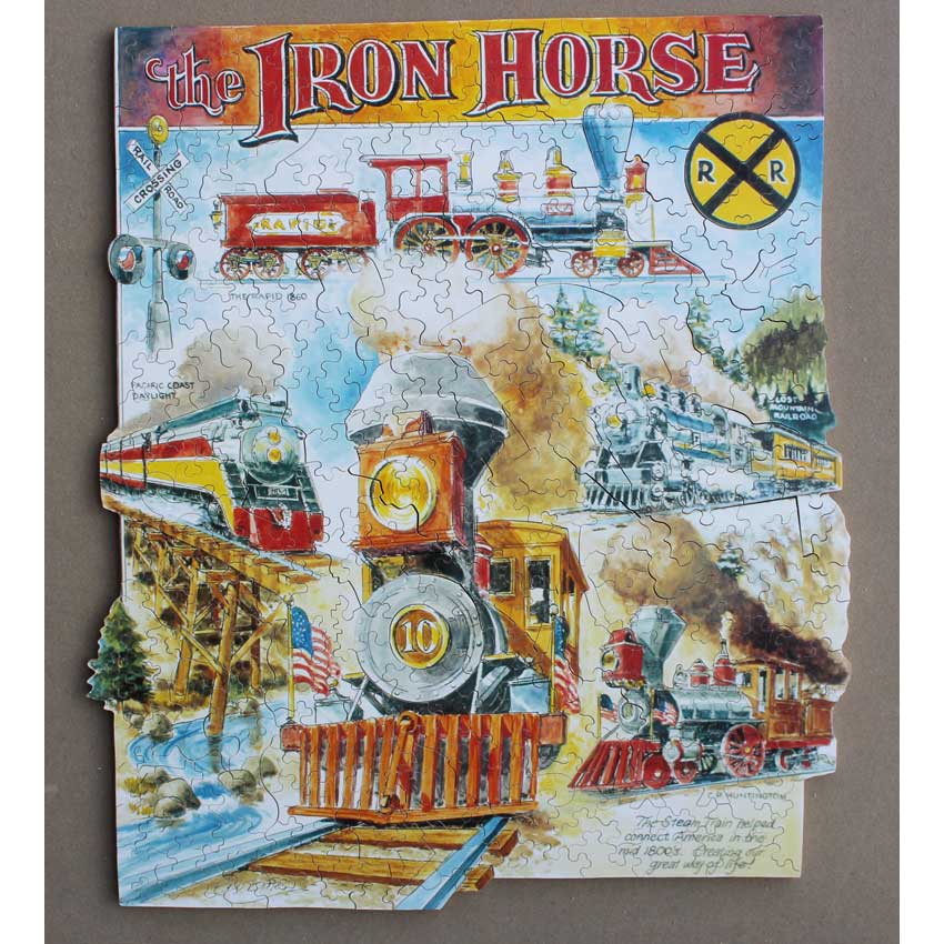 What can we say about this amazing puzzle by artist Bob Bates. Like trains? Like Puzzles? Well then you are sure to like this one. Such an interesting piece of railroad history recorded in the image. Plus, some really cool train silhouettes