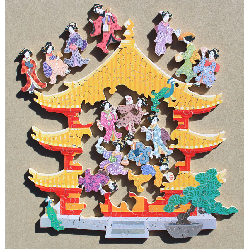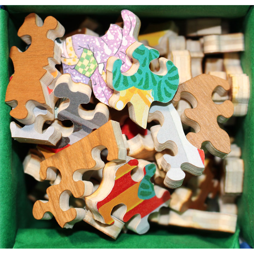 Good – Puzzle has been done a few times and there may be a number of pieces showing wear on their edges. The wood is in good structural condition, it’s mostly cosmetic issues with the paper layer being worn.