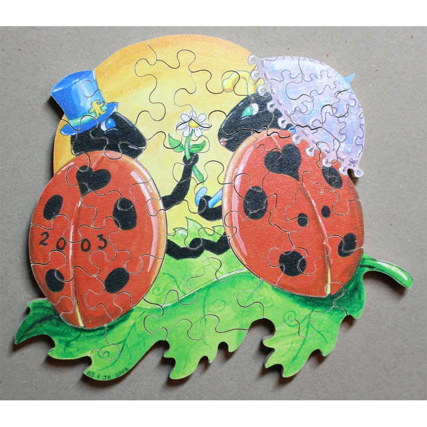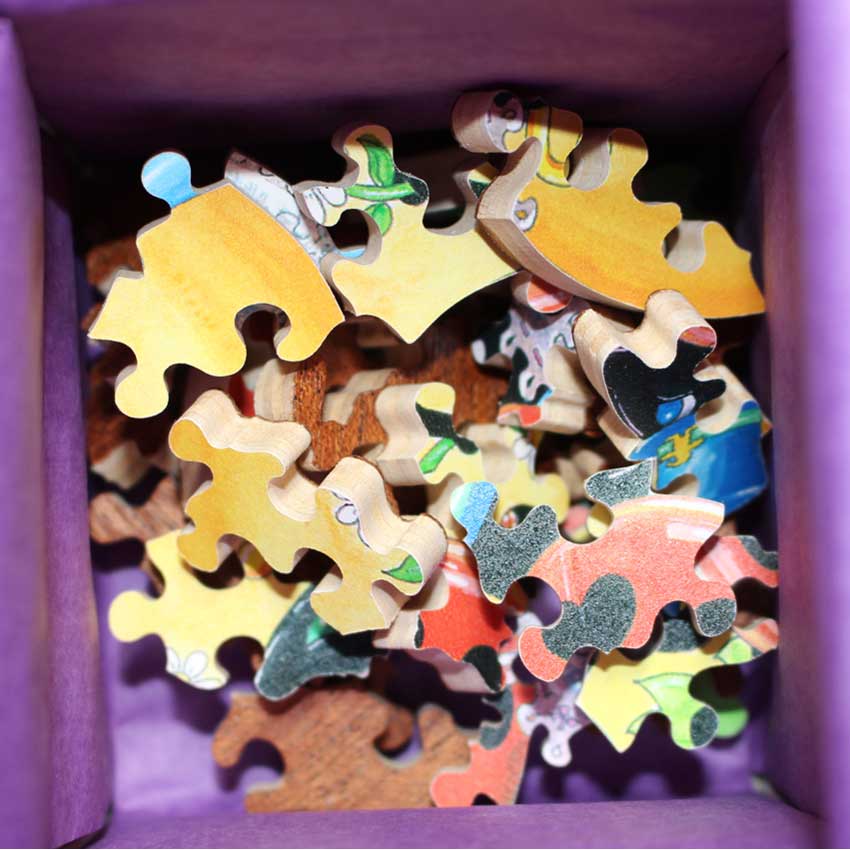 Good – Puzzle has been done a few times and there may be a number of pieces showing wear on their edges.   The wood is in good structural condition, it’s mostly cosmetic issues with the paper layer being worn.