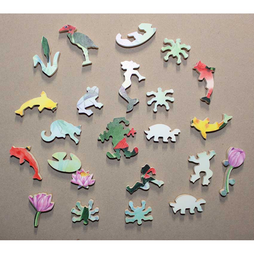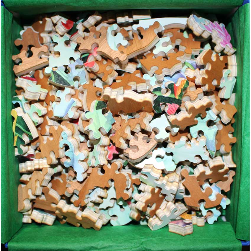 Good – Puzzle has been done a few times and there may be a number of pieces showing wear on their edges. The wood is in good structural condition, it’s mostly cosmetic issues with the paper layer being worn.